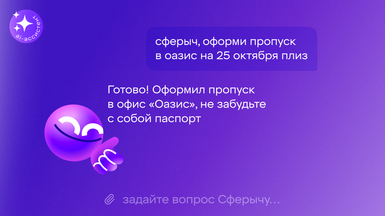 AI‑ассистент Сферыч говорит «по‑человечески». Короткие и понятные ответы, уместные уточнения, никакого канцелярита. Так сложные вопросы сотрудников превращаются в простой и понятный диалог с умными подсказками и быстрыми действиями в несколько кликов.