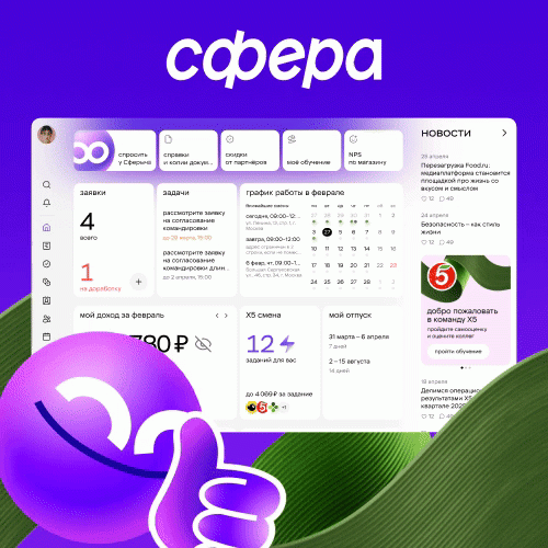 Сфера Х5 — это цифровая HR‑платформа для более 400 000 сотрудников Х5, объединяющая ключевые сервисы для работы с первого дня до exit‑интервью. Здесь сотрудники планируют отпуск, оформляют документы и справки, проходят обучение, ставят цели, рекомендуют друзей и делятся обратной связью.