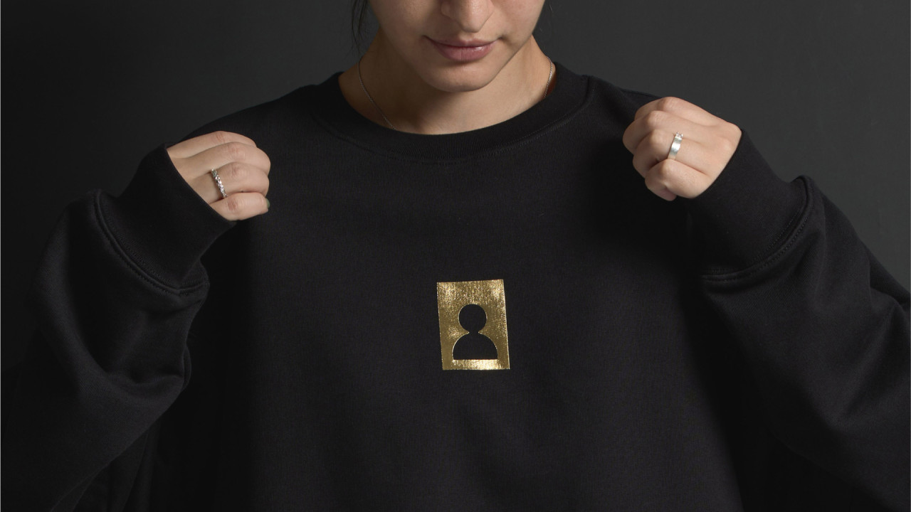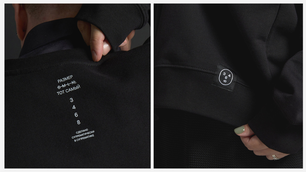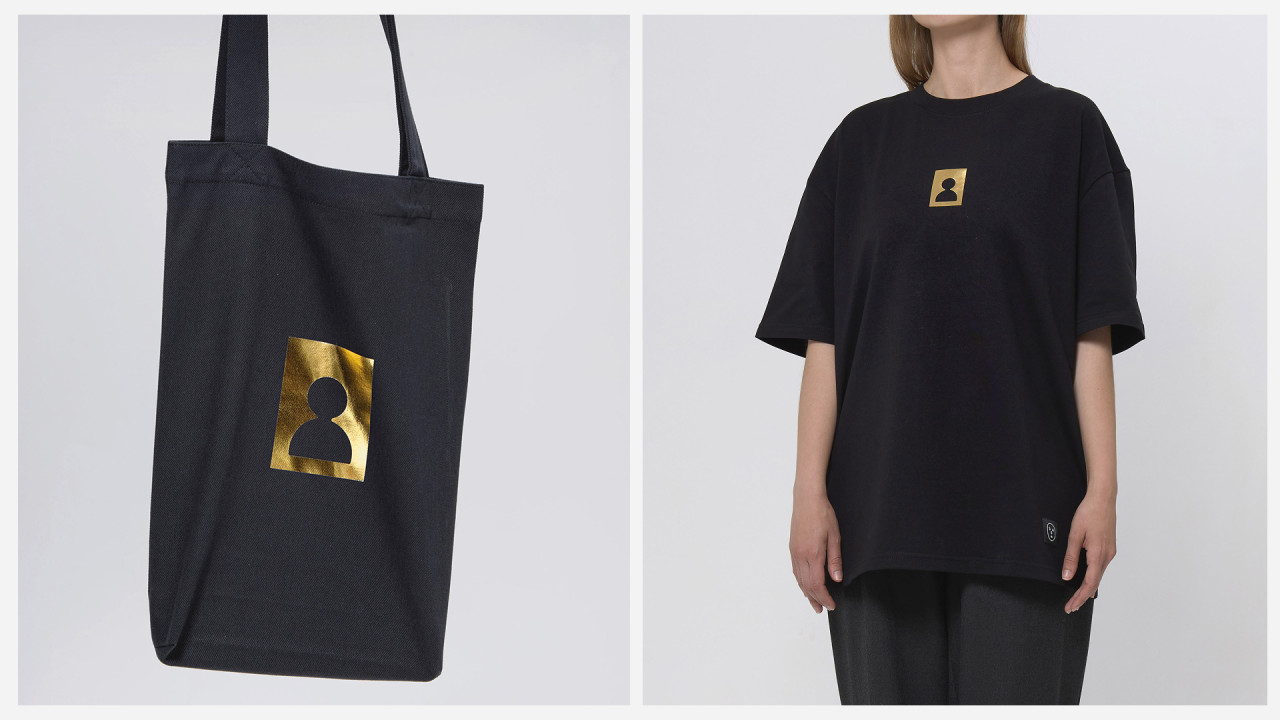 Первый дроп бренда 3468 от Супрематики. Мерч с иконкой человека, выполненный из плотного чёрного хлопка, картона и чистой золотой краски.