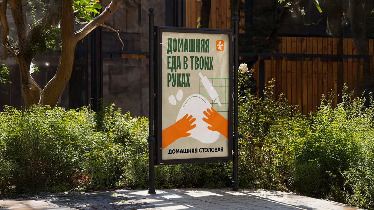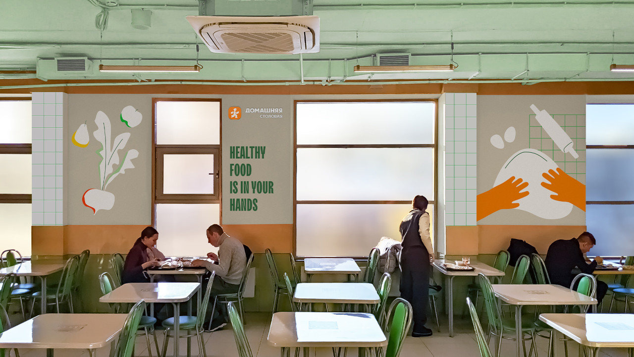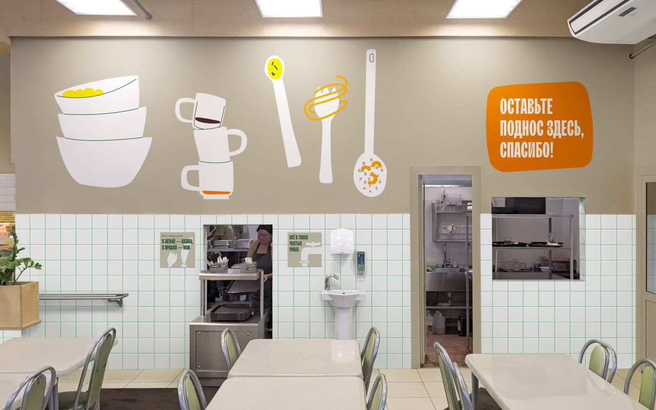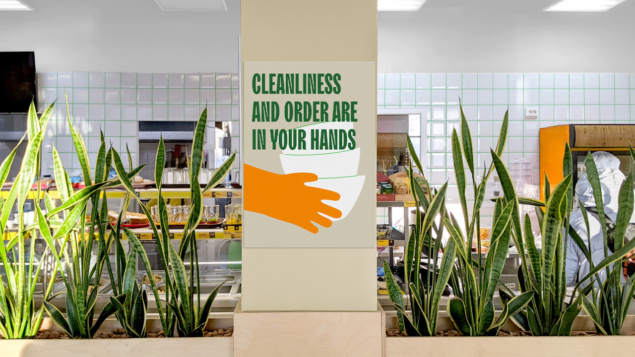 An important place in the canteen is the food counter, and one of the key elements is the tray, which the visitor begins and ends the journey with. The slogan "Everything is in your hands" is a phrase with a double meaning. On the one hand, you hold the tray and put the chosen food on it, and on the other hand, the canteen provides a resource and inspires important decisions. The slogan is built into the system of messages that accompany the guest in the canteen. Hands have become a visual metaphor for the brand character, and the soft lines and smile of the hero reflect friendliness. The corporate colors are natural orange, green and beige. An important element of the design was the ceramic tiles: this familiar element of canteens was refreshed thanks to green grout.