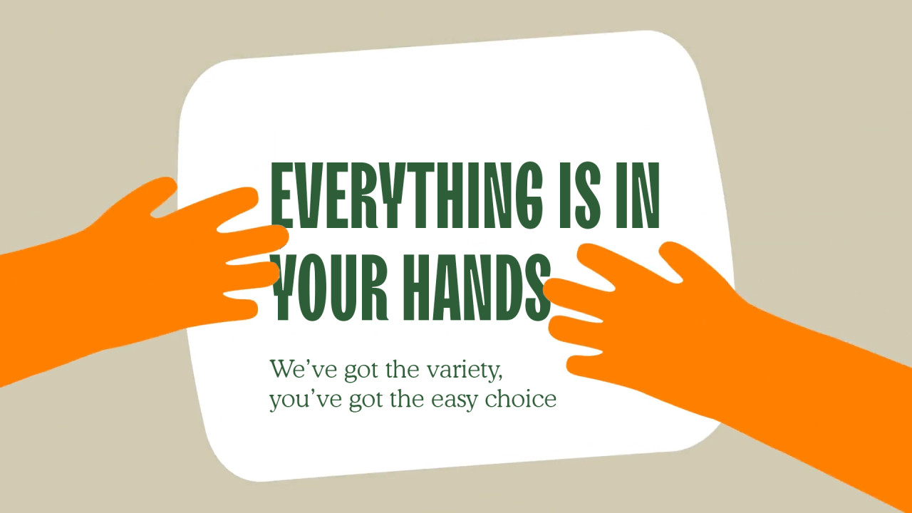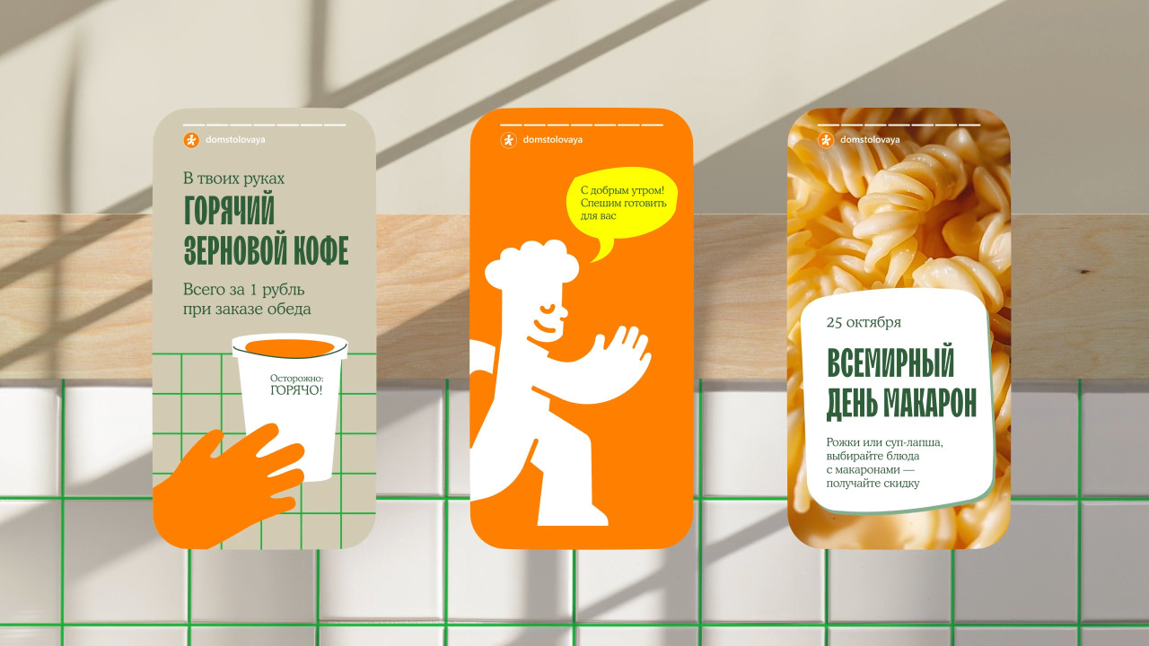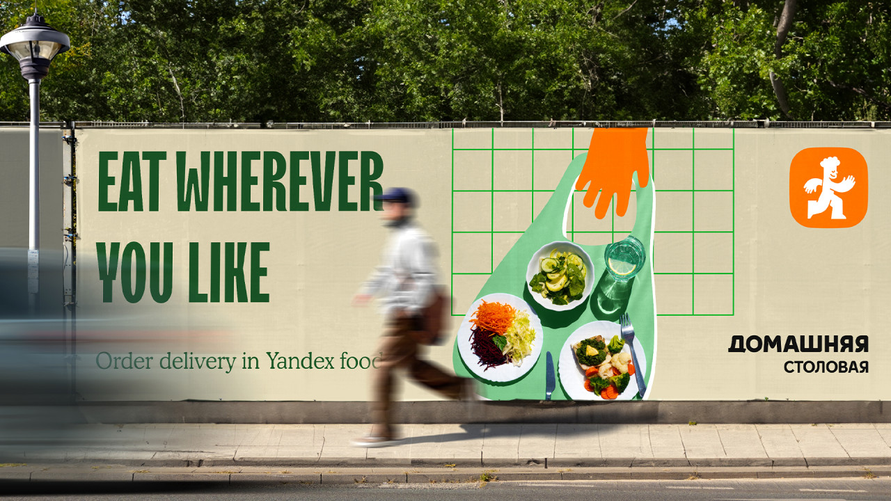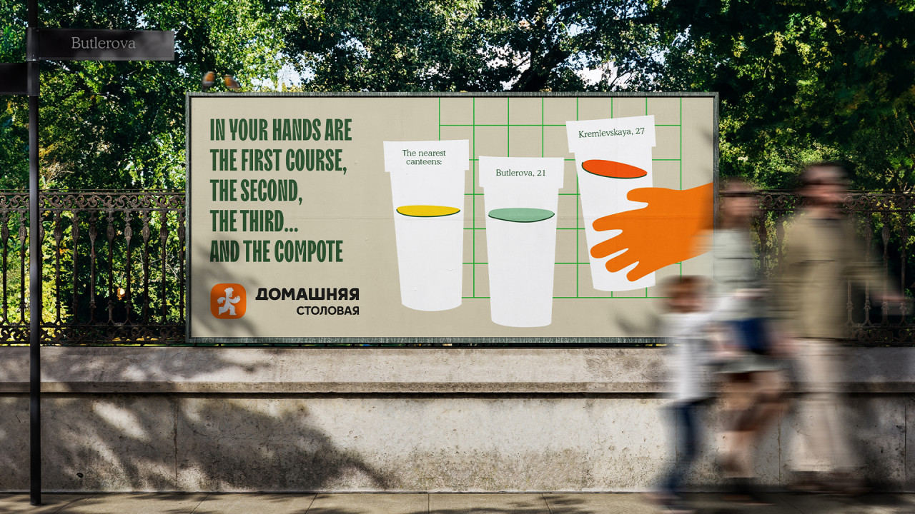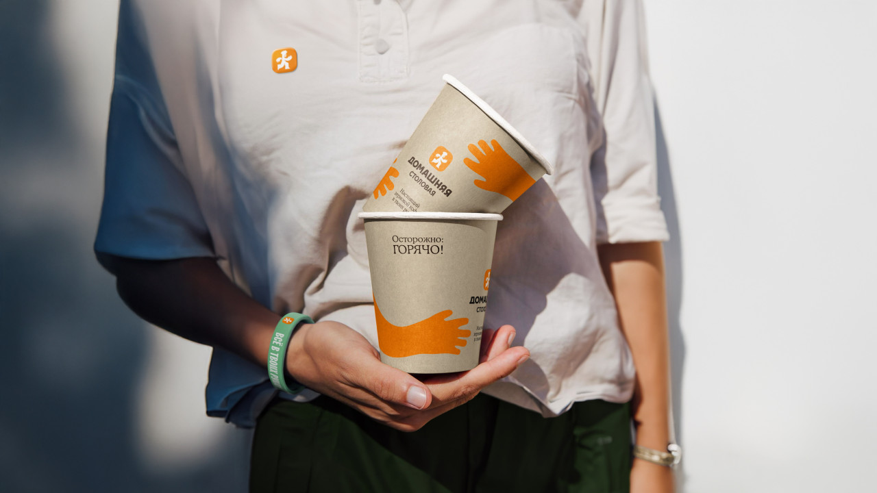 An important place in the canteen is the food counter, and one of the key elements is the tray, which the visitor begins and ends the journey with. The slogan "Everything is in your hands" is a phrase with a double meaning. On the one hand, you hold the tray and put the chosen food on it, and on the other hand, the canteen provides a resource and inspires important decisions. The slogan is built into the system of messages that accompany the guest in the canteen. Hands have become a visual metaphor for the brand character, and the soft lines and smile of the hero reflect friendliness. The corporate colors are natural orange, green and beige. An important element of the design was the ceramic tiles: this familiar element of canteens was refreshed thanks to green grout.