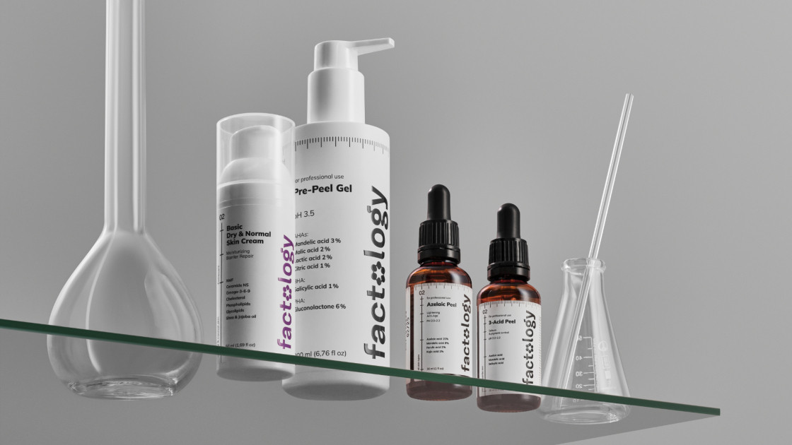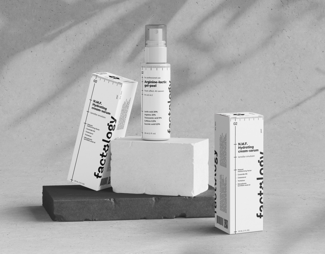 Мы запустили Factology — «профессиональную простоту» в строгой обёртке. Отказались от яркой поп-эстетики в пользу чистоты доказательности: белый фон как метафора стерильности и врачебного халата, чёткая нейтральная типографика и крупные надписи на торцах для мгновенной идентификации. Тонкие графические линии — отсылка к картированию пациента и следам от инъекций — стали фирменным мотивом, который легко масштабируется от коробки до кабинета и обучающих материалов. Упаковка проста в использовании и логична по содержанию, но выглядит профессионально — продукт воспринимают как инструмент, а не как товар масс-полки. Factology органично встраивается в рабочее пространство врача: начинающие получают понятный стандарт для практики, опытные — надёжный инструмент, компания — новую продаваемую категорию с быстрой интеграцией в ассортимент, снижением затрат и повышением статуса на рынке.