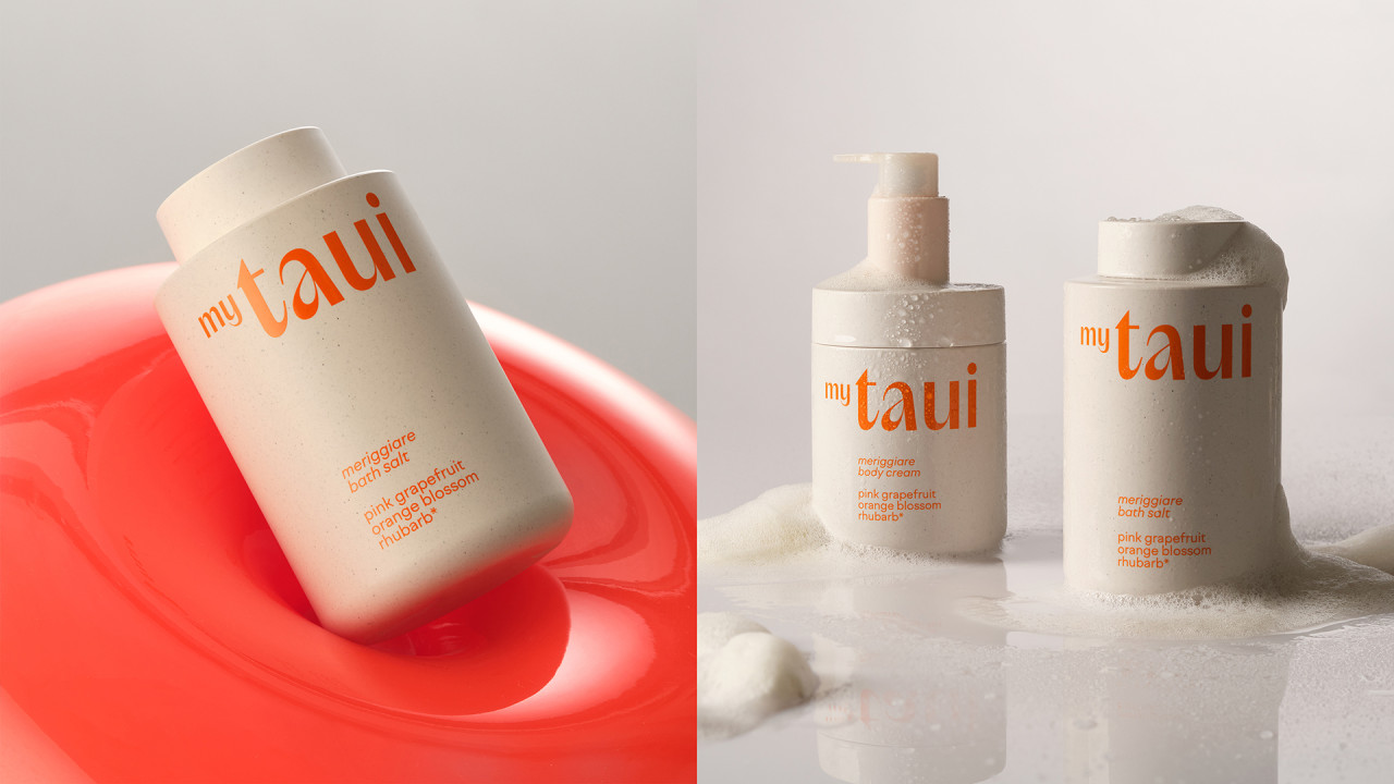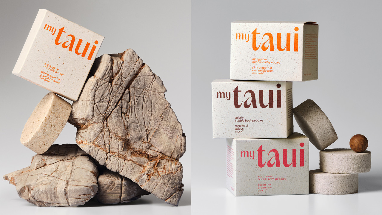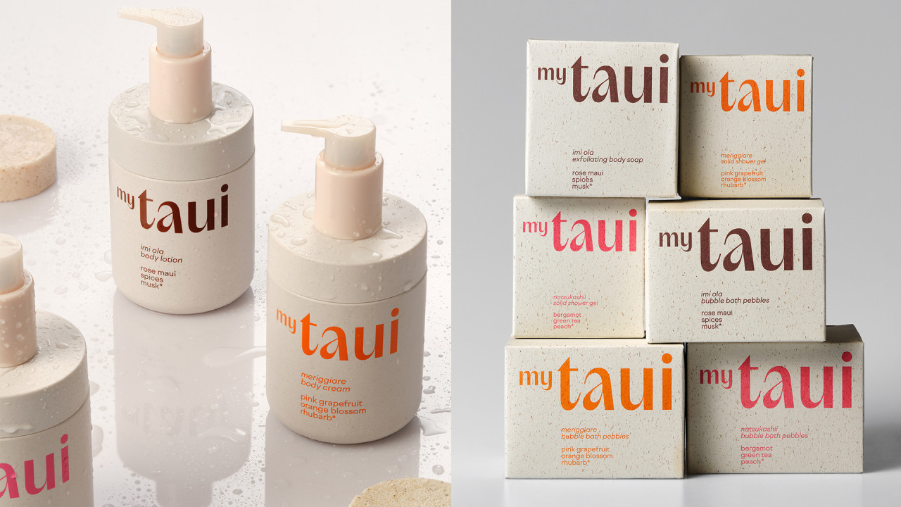 Философия myTAUI выражена в дизайне: матовые флаконы с крапинками создают тактильную фактуру, лаконичная форма подчеркивает выразительный логотип. Каждая позиция выделена акцентным цветом — от терракотового до зеленого и розового, отражающих настроение формулы. Минималистичная типографика сочетает ясность с характером, а функциональные детали — встроенные дозаторы и прямая печать на поверхности — обеспечивают долговечность во влажной среде.