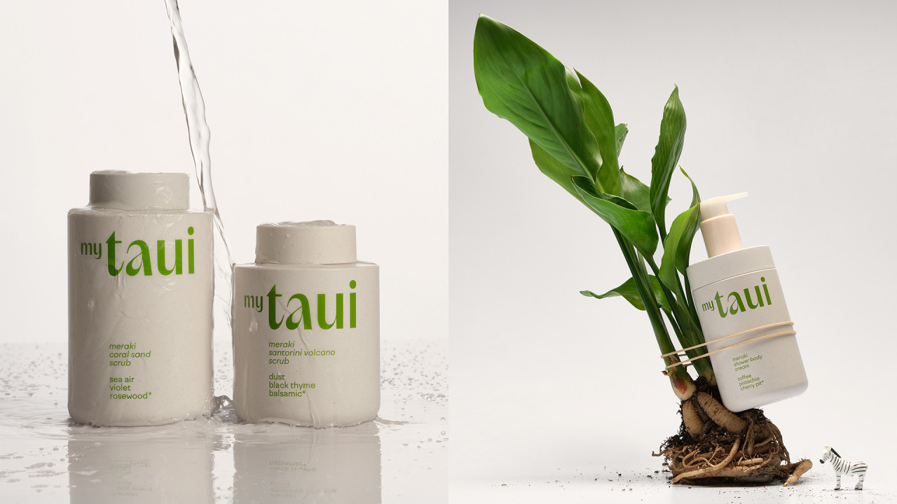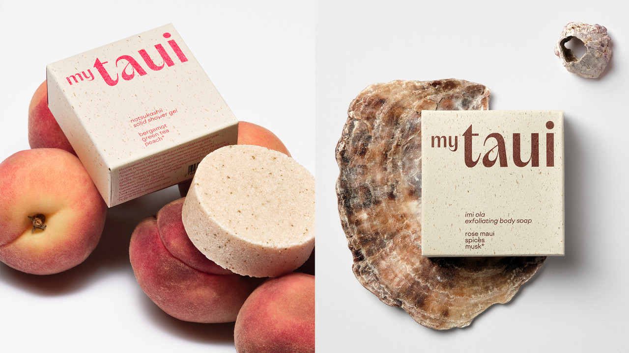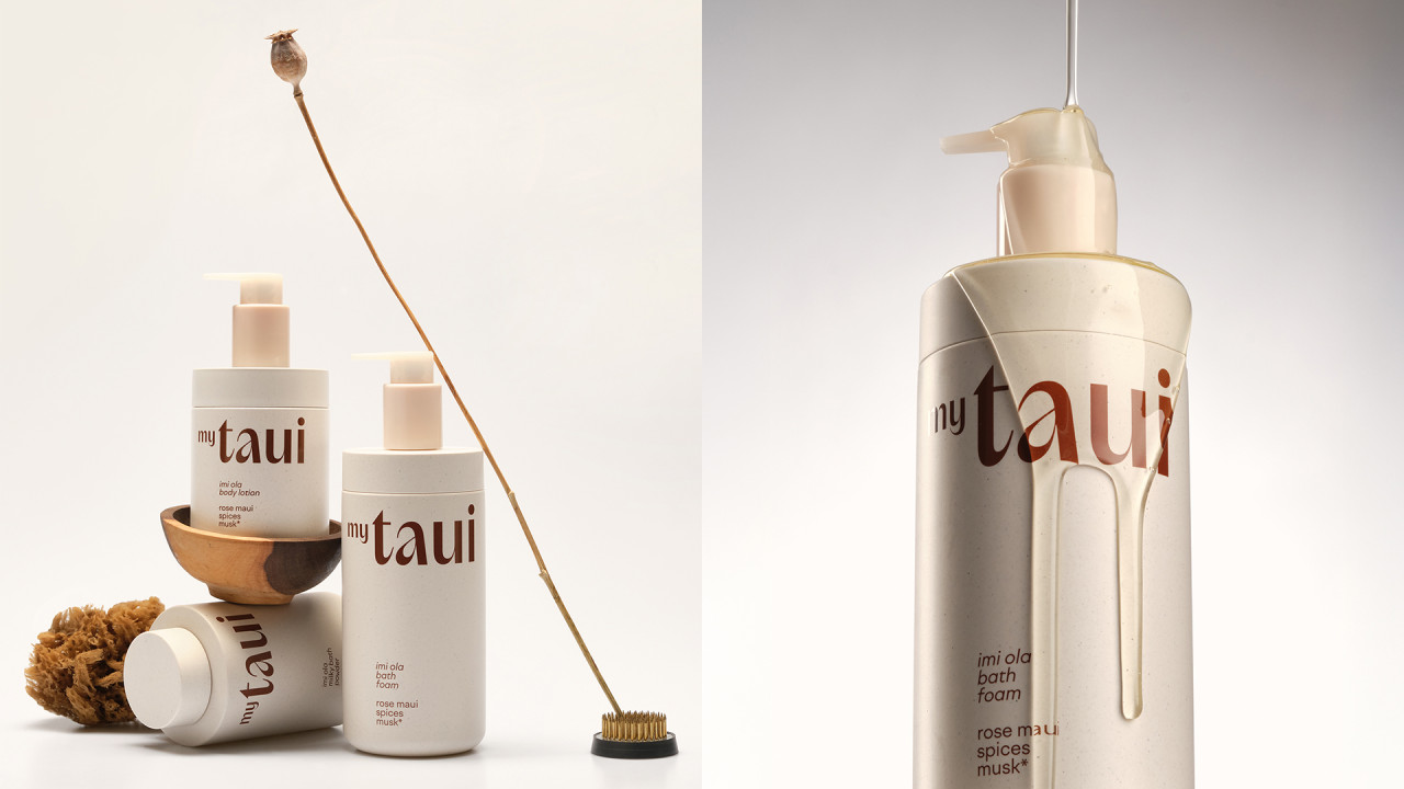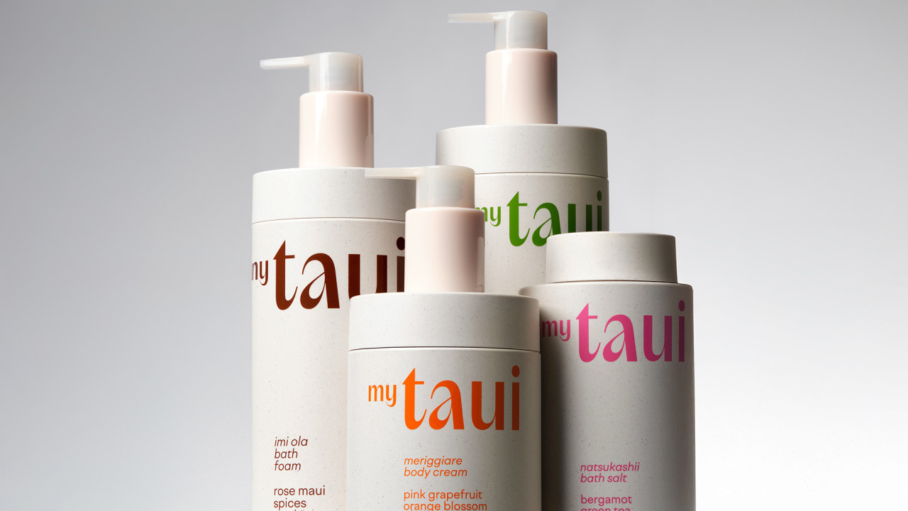 Философия myTAUI выражена в дизайне: матовые флаконы с крапинками создают тактильную фактуру, лаконичная форма подчеркивает выразительный логотип. Каждая позиция выделена акцентным цветом — от терракотового до зеленого и розового, отражающих настроение формулы. Минималистичная типографика сочетает ясность с характером, а функциональные детали — встроенные дозаторы и прямая печать на поверхности — обеспечивают долговечность во влажной среде.