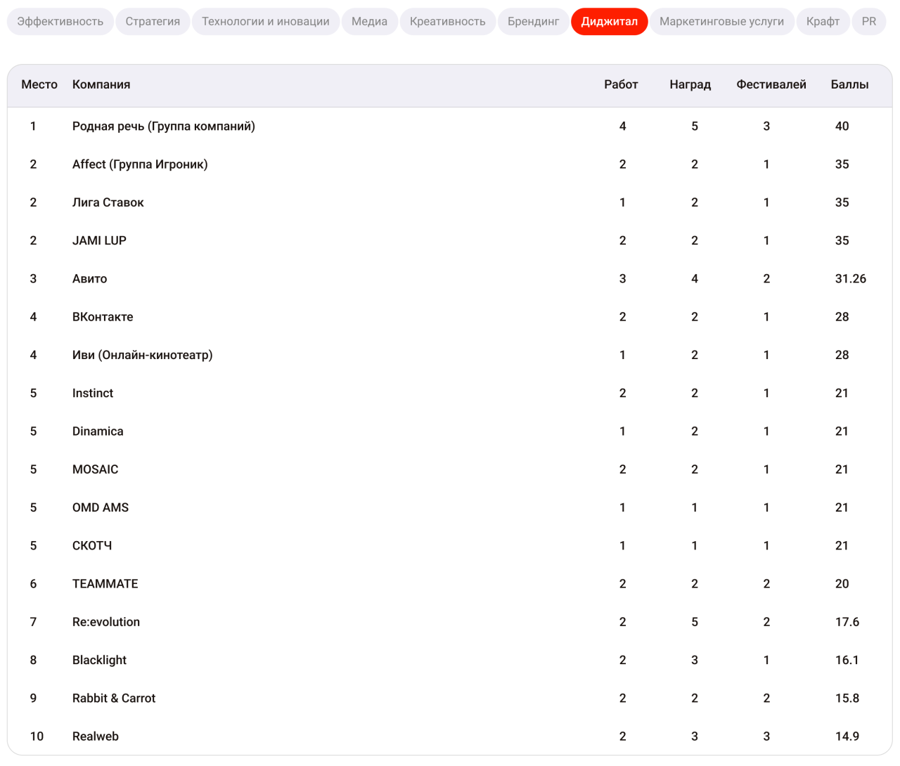 По итогам семи крупнейших фестивалей в категории «Диджитал» Национального рейтинга рекламных агентств Sostav бесспорным победителем стала группа компаний «Родная Речь», набравшая впечатляющие 40 баллов. Агентство заслуженно поднялось на вершину благодаря пяти наградам за четыре яркие работы, представленные на трех престижных фестивалях.