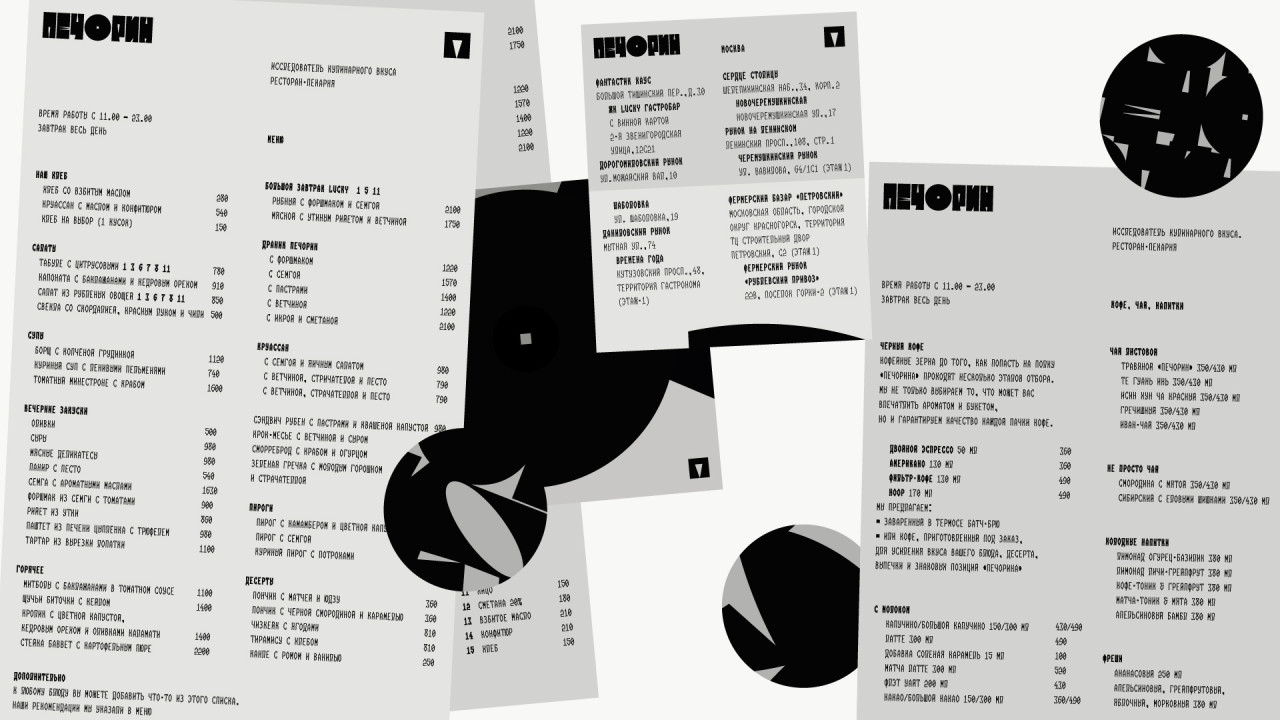 Миссия бренда «Печорин» — cтать достопримечательностью Москвы и кулинарно-культурным центром России. Теперь он ресторан-пекарня, исследователь кулинарных вкусов, романтик нового времени, который уверен в себе и знает чего хочет.Мы сделали айдентику про ремесленность и амбициозность. Исходя из характера нового бренда и специфики выпускаемой продукции, мы разработали акцидентный шрифт с тремя разными начертаниями, вариативный текстовый шрифт для меню и лого, и шрифт символьный для привлечения внимания к продуктам пекарни. Рисунок и характер букв вдохновлен процессом нарезки теста, самим выпекаемым хлебом, пластикой ингредиентов, смелыми формами и вкусом блюд, которые создаются в «Печорине». Думая над логотипом и шрифтом и имея в виду миссию бренда, мы не могли не учитывать историческое наследие и традиции русской и советской графики 20-х годов прошлого века. В характере наших букв можно увидеть связь с работами создателя стиля «советский ампир» Сергея Чехонина.