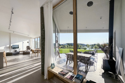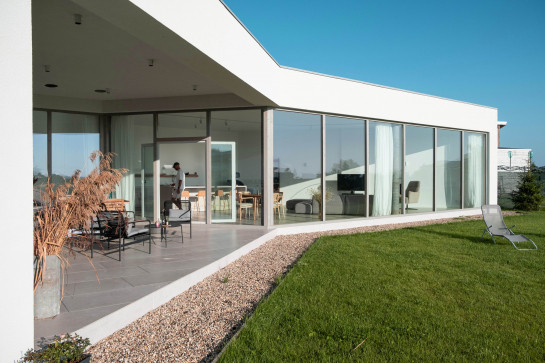 Панорамные окна в пол с раскрытием видовых характеристик на озеро, с созданием уютного патио, являющегося частью общего объема. Навес для двух машин также является тектоническим продолжением геометрии дома. Ломаные линии плана продиктованы раскрытием кухни-гостиной, а также сложной формой участка. Компактная непродуваемая терраса является композиционным центром и яркой чертой этого проекта.