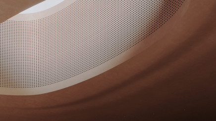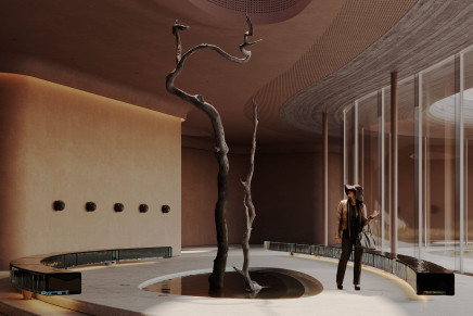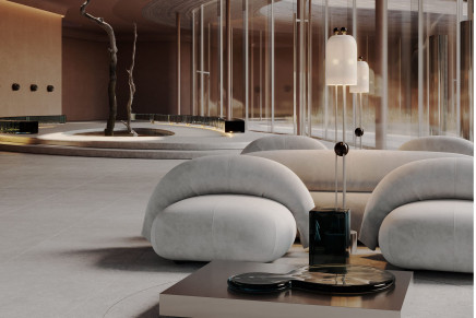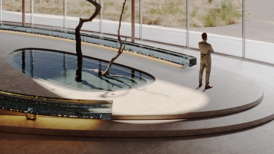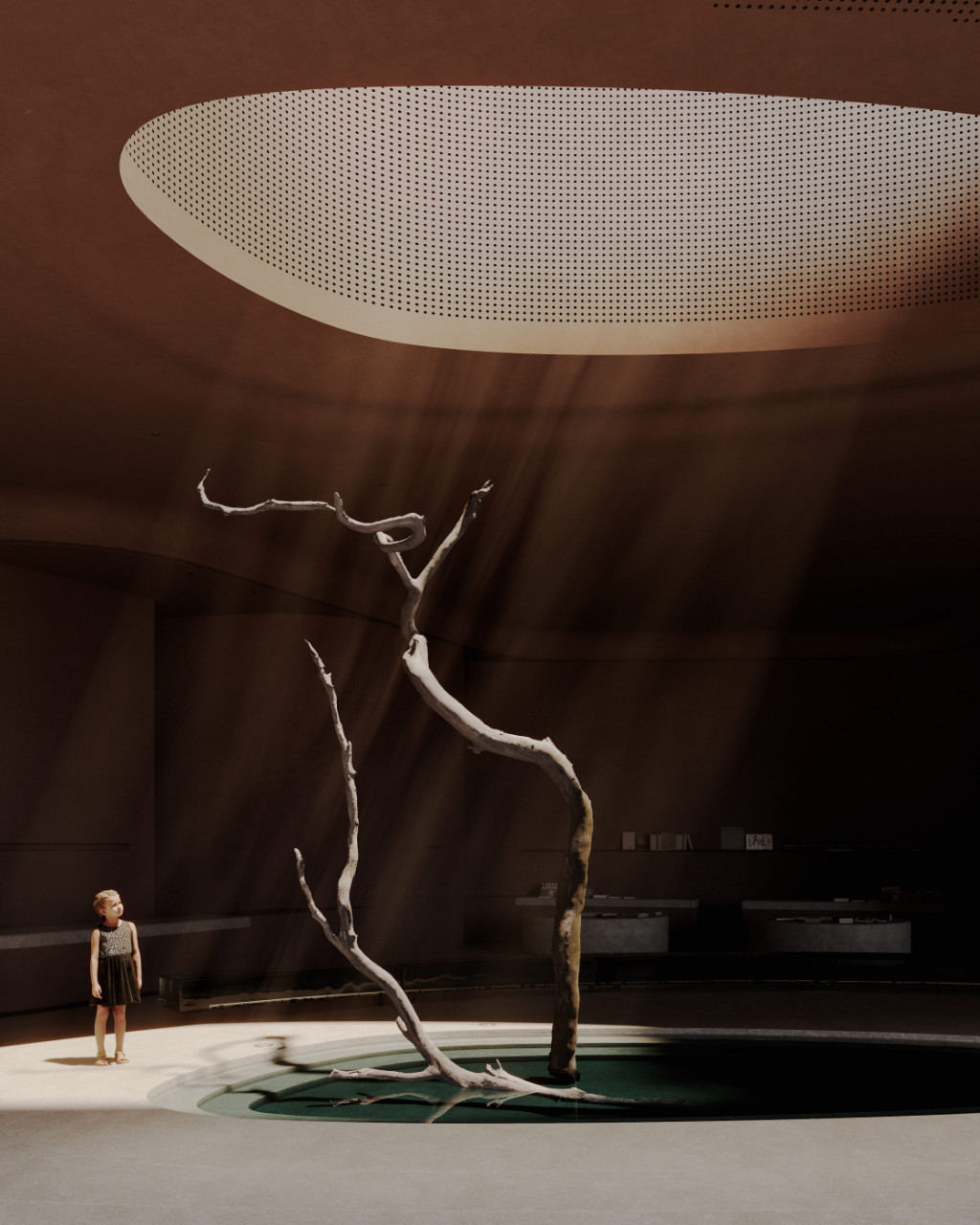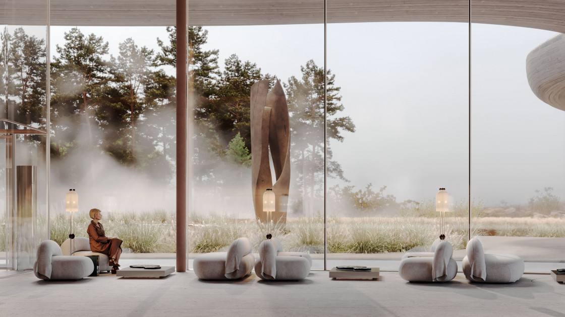 В проекте команда вдохновлялась локальными природными архетипами. Дерево стало формообразующим героем: линии колец ствола стали основой планировочного решения и пластики интерьера. Эмоциональное ядро – приподнятая над пространством композиция – водоем из которого прорастает дерево. Он повторяет форму светового фонаря, задающего сценический акцент. Мотив воды продолжается в стеклянных скамьях, напоминающих замёрзшую гладь зимнего Байкала. Сложные песочные оттенки в сочетании с глубокими переливами стекла составляют палитру интерьера. Пространство создано как скульптура: мягкие контуры и силуэты, отточенные объёмы и пропорции. Выразительность форм и линий подчеркнута текстурой материалов. Все предметы мебели выполнены по эскизам архитекторов. Лаунж-зона размещена вдоль панорамного остекления, настраивая гостей на созерцание природы и искусства. Интерьер погружает в атмосферу уважения к месту, его культурному и природному наследию.