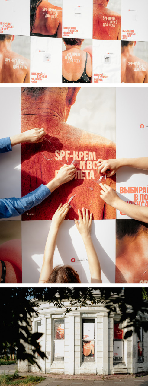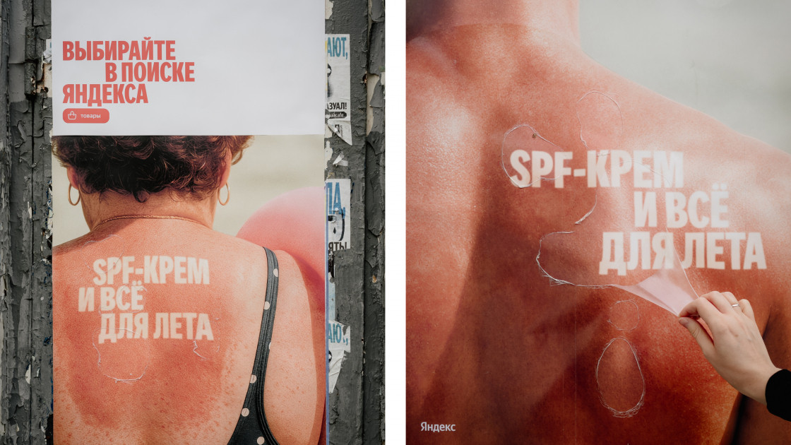 В Москве «самое жаркое лето», в Поиске по Товарам Яндекса можно найти всё от SPF-крема до напольного вентилятора по привлекательной цене. Все уже видели обычные рекламные плакаты, ими никого не удивишь. Мы решили попробовать сделать интерактивные плакаты со слоем, имитирующим облезшую кожу. Многие из нас любят аккуратно «содрать» эту белую плёнку, но такой загар крайне вреден, так пусть он будет только в рекламе.