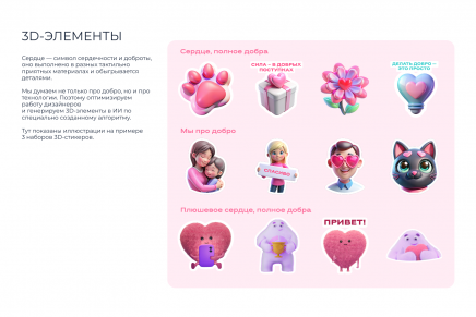 Главным визуальным образом всего стиля является сердце, оно символизирует доброту и сердечность тех людей, которые занимаются благотворительностью. Сердце подсказало выбор общей цветовой палитры: нежные пастельные цвета, с акцентом на приятный розовый оттенок.