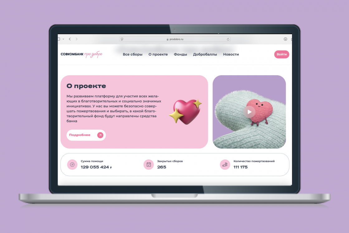 Совкомбанк про Добро - это благотворительный проект, в котором добрые люди помогают проверенным фондам, а Совкомбанк умножает пожертвования за счёт собственных средств. Для проекта была создан новый фирменный стиль, отражающий его характер: сердечный, добрый и полный тепла.