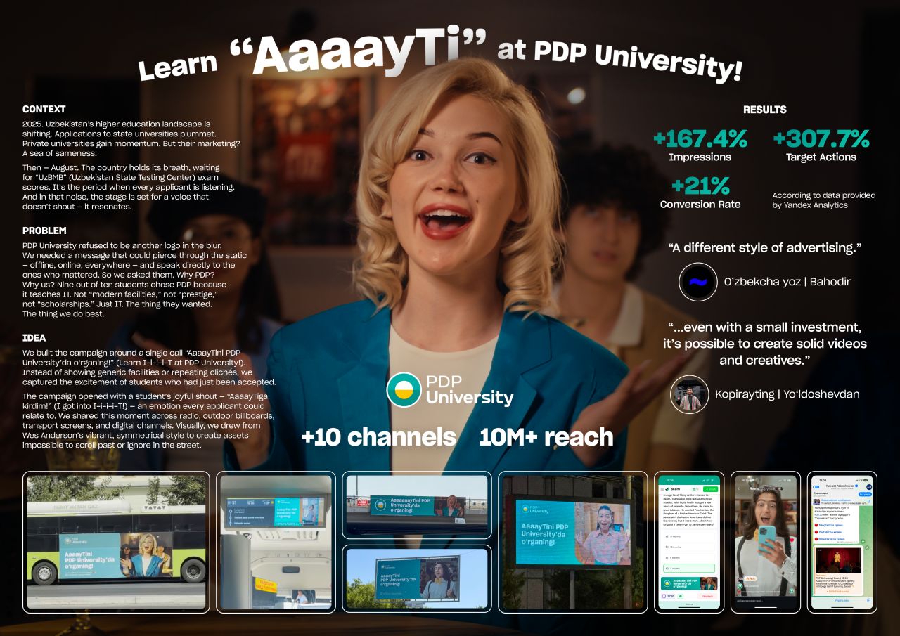 We built the campaign around a single call “AaaayTini PDP University’da o‘rganing!” (Learn "AaaayTi" at PDP University!). Instead of showing generic facilities or repeating clichés, we captured the excitement of students who had just been accepted.