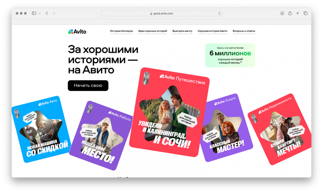Авито запустил новое позиционирование — «Хорошие истории», объединившее все направления бизнеса в рамках единой коммуникационной стратегии. Первая масштабная имиджевая кампания бренда построена на реальных отзывах пользователей и поддерживает социальную миссию Авито — помогать людям менять жизнь к лучшему. Проект стал точкой сборки бренда, связав воедино Товары, Услуги, Недвижимость, Путешествия, Работу и Авто.