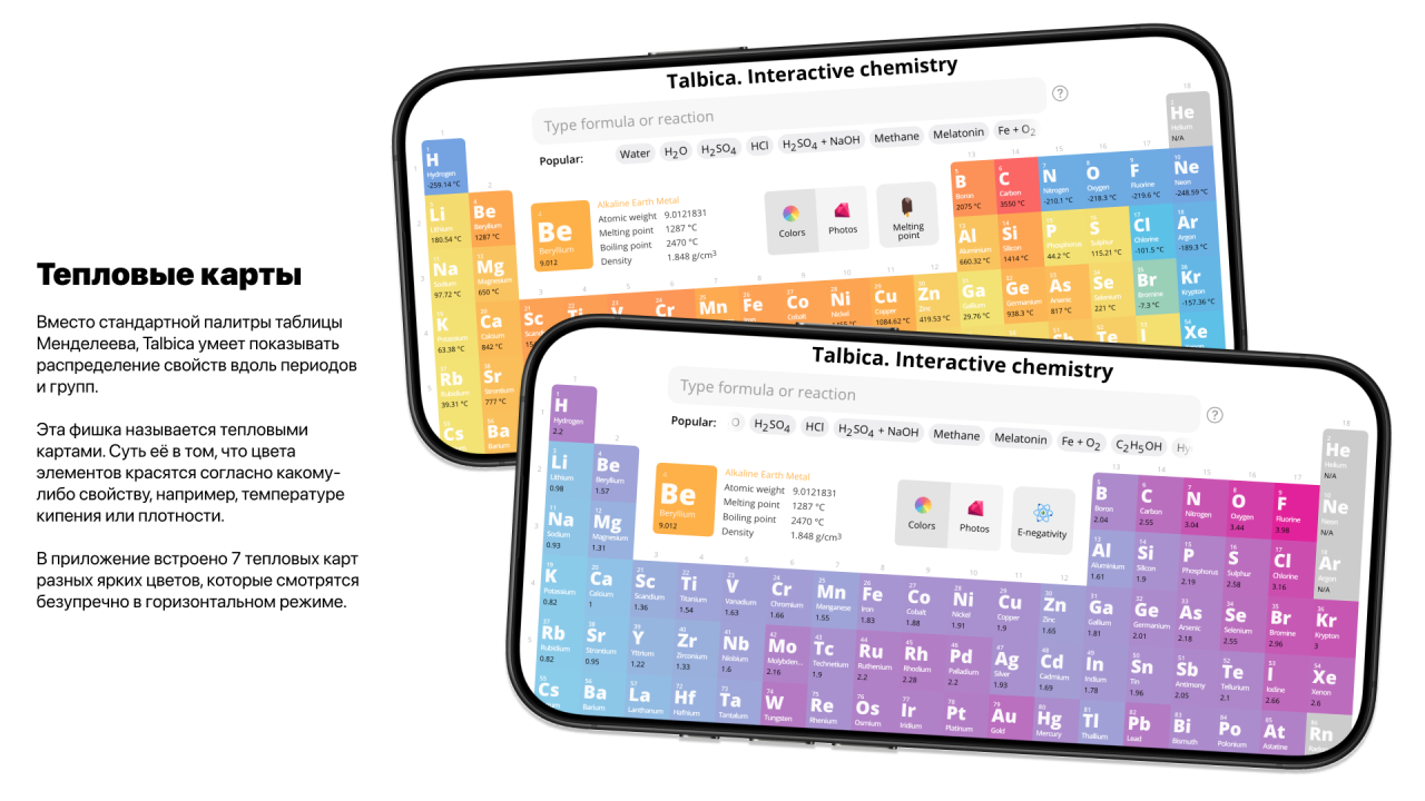 Помимо стандартной раскраски по типам элемента, Талбица умеет строить тепловые карты. С помощью них школьник может увидеть воочию, как распределяется, например, температура кипения или плотность по периодам и группам.