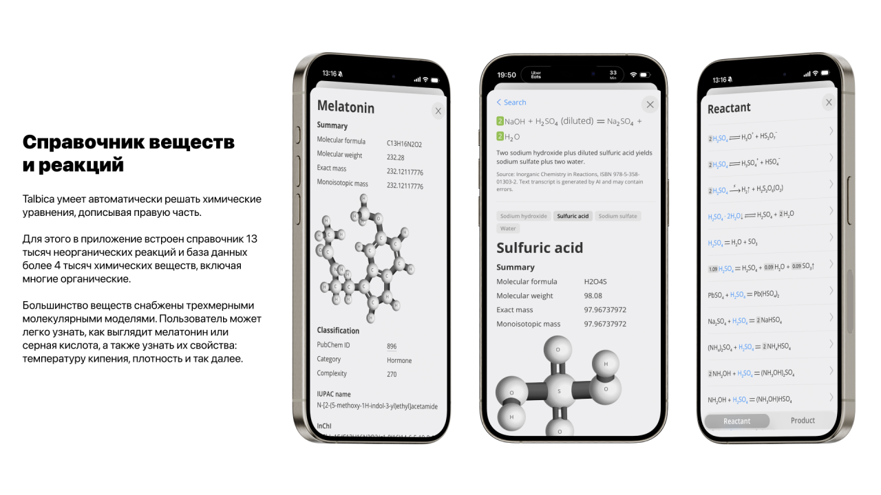Помимо этого, Талбица содержит информацию о 13 тысячах химических реакций и умеет решать уравнения. Каждая реакция снабжена условиями протекания и разбита на вещества, многие из которых также имеют трехмерную модель — на этот раз молекулярную, из атомов и связей между ними.