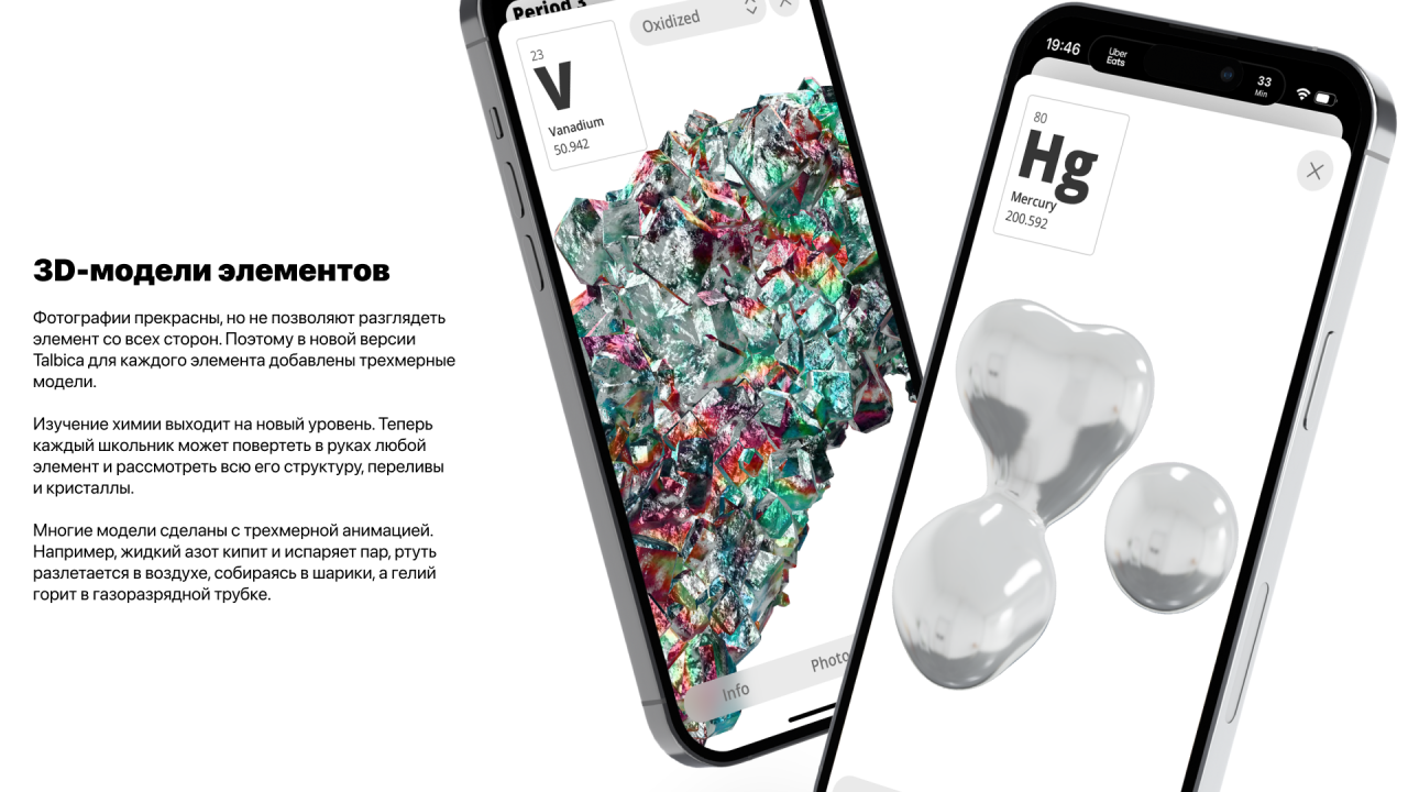 В новую версию таблицы добавлены 3D-модели каждого элемента, за исключением самых радиоактивных, которые распадаются слишком быстро, чтобы их вообще можно было заснять. Многие модели даже обладают трехмерной анимацией. Например, жидкий азот кипит в пробирке, гелий светится в газоразрядной трубке, а ртуть разлетается на шарики. Это не декоративная графика — это визуализация самой сути элементов, с учетом всех особенностей их блеска, поверхности и структуры. Ничего подобного до этого не существовало в природе.