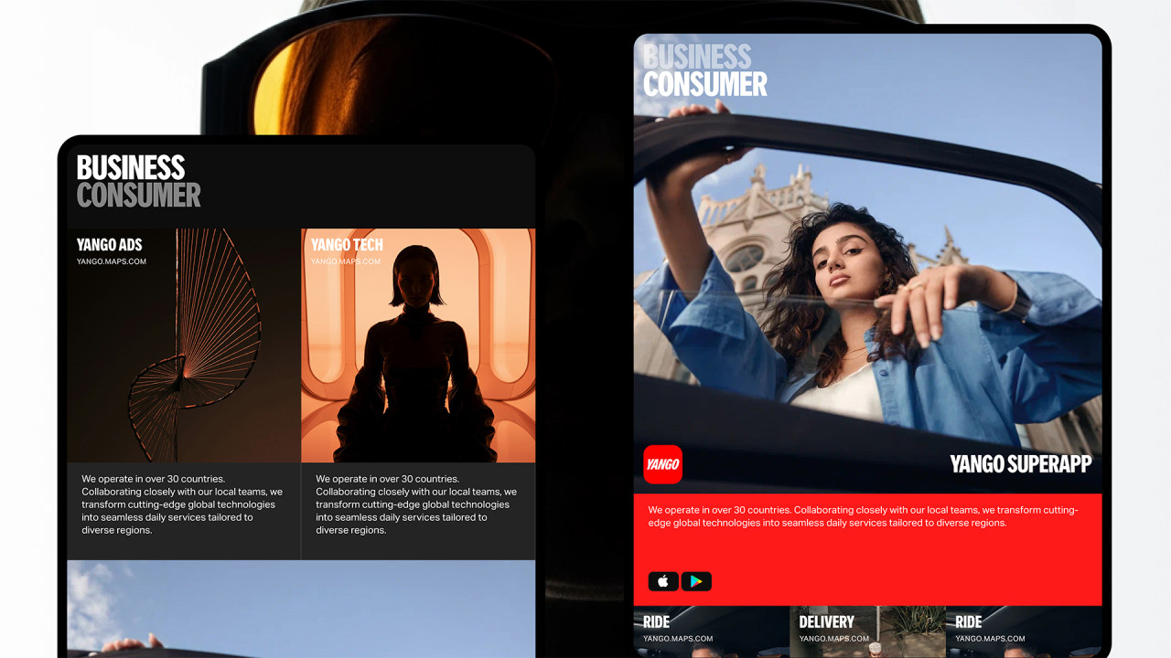 В каждом регионе присутствия Yango Group портфель сервисов уникален, поэтому для отдельной страницы всех сервисов было важно создать структуру, которая подаёт информацию ясно и последовательно. Мы разделили экран на два направления: потребительские сервисы и бизнес-решения. В блоке для пользователей отдельным сегментом представлены все сервисы Yango Super App, а рядом — другие consumer-направления, не входящие в приложение. Такое деление помогает быстро находить нужное и сохраняет чёткую границу между аудиториями.