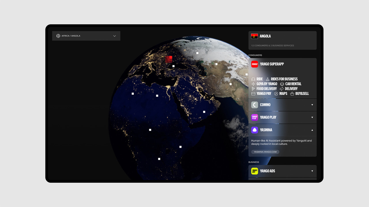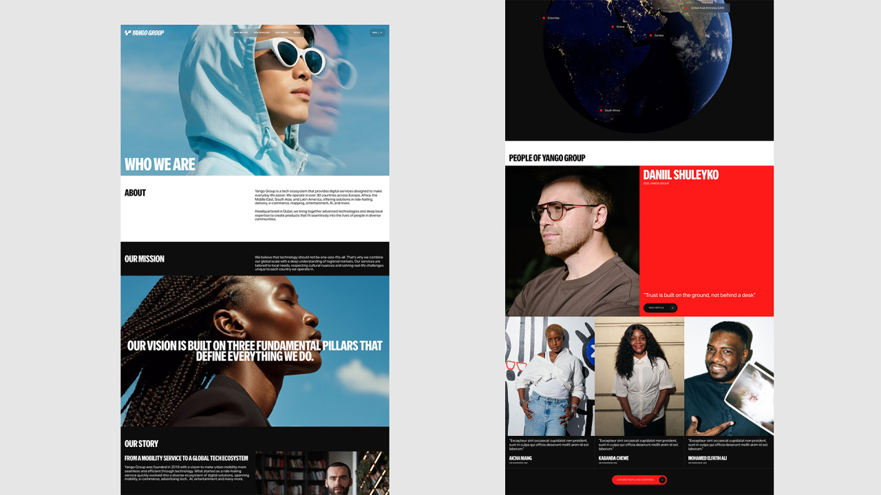 Работа над корпоративным сайтом стала частью большой коллаборации с Yango Group — международной экосистемой, объединяющей сервисы для пользователей и бизнеса: транспорт, доставку, финтех, развлечения, e-commerce и другие направления. География присутствия компании охватывает более 30 стран Африки, Латинской Америки, Европы и Ближнего Востока.