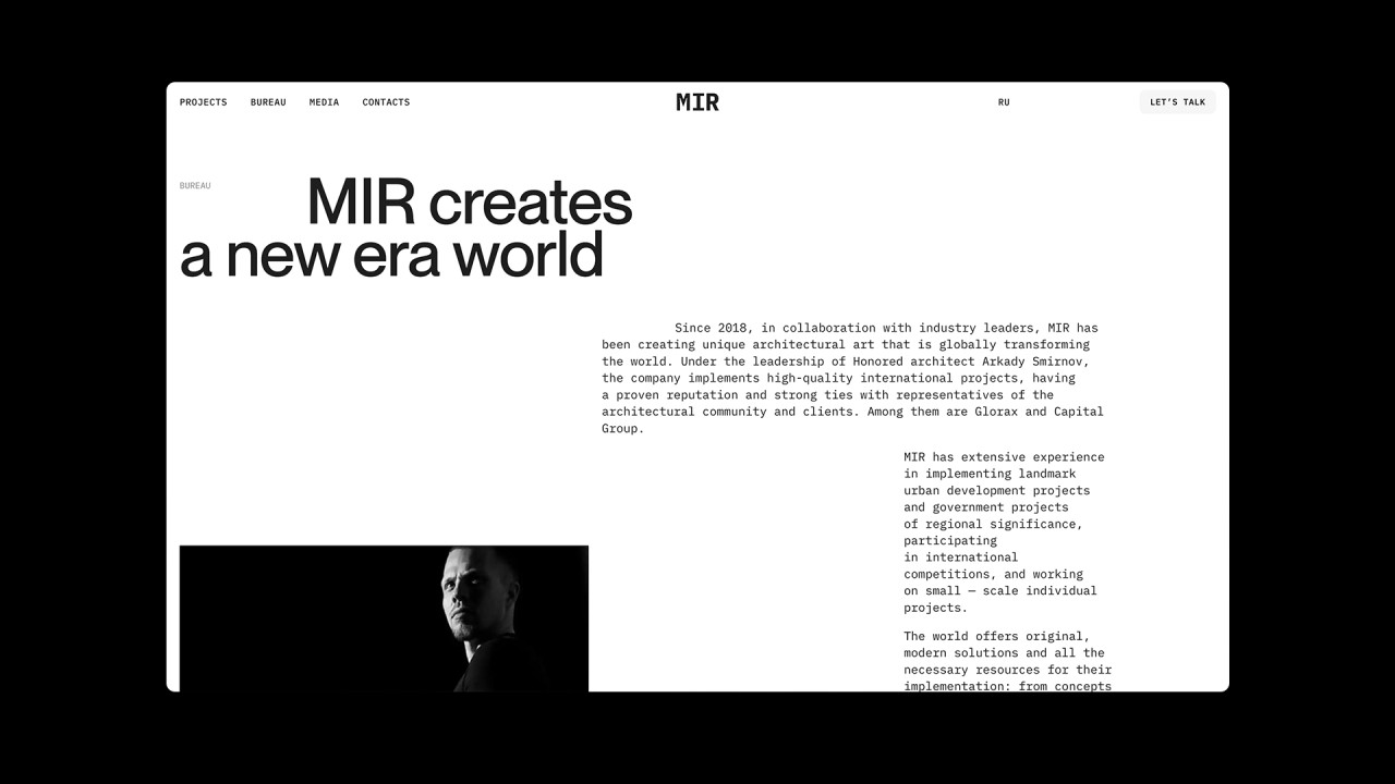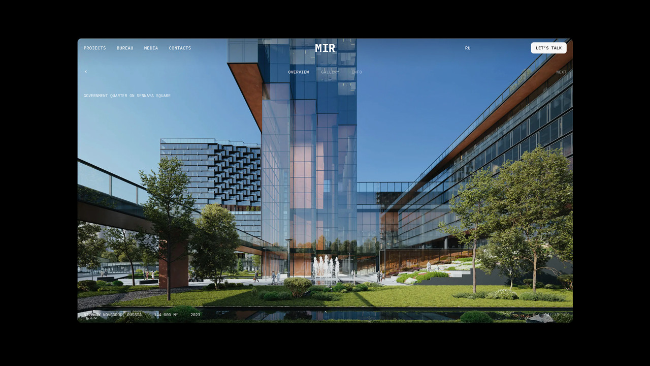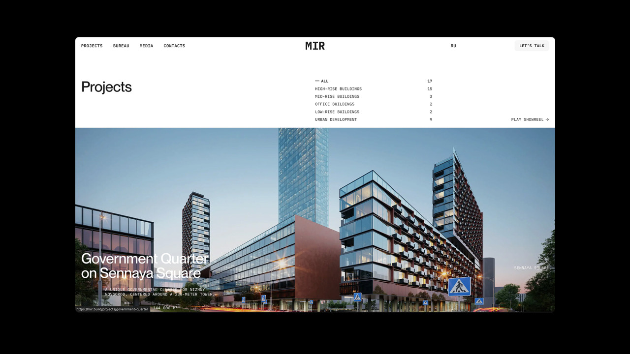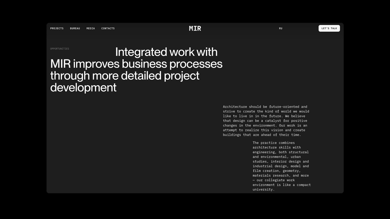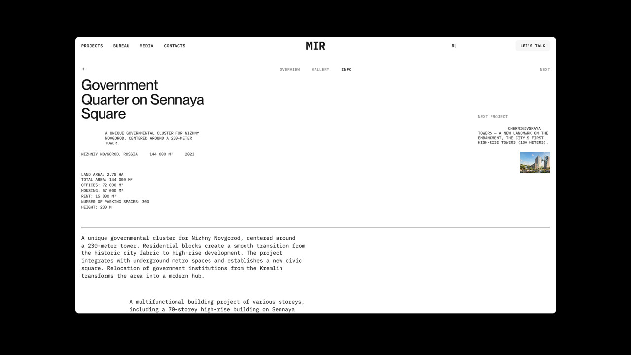 Дизайн и разработка сайта архитектурного бюро MIR, которое специализируется на крупных проектах, в частности высотных и многофункциональных, а также жилых зданий, офисов и комплексном развитии территорий.
