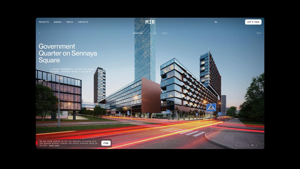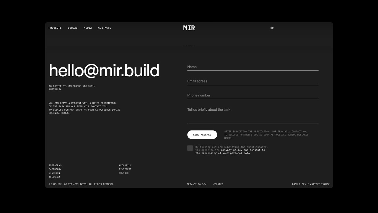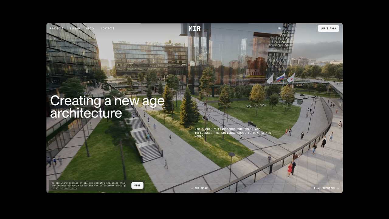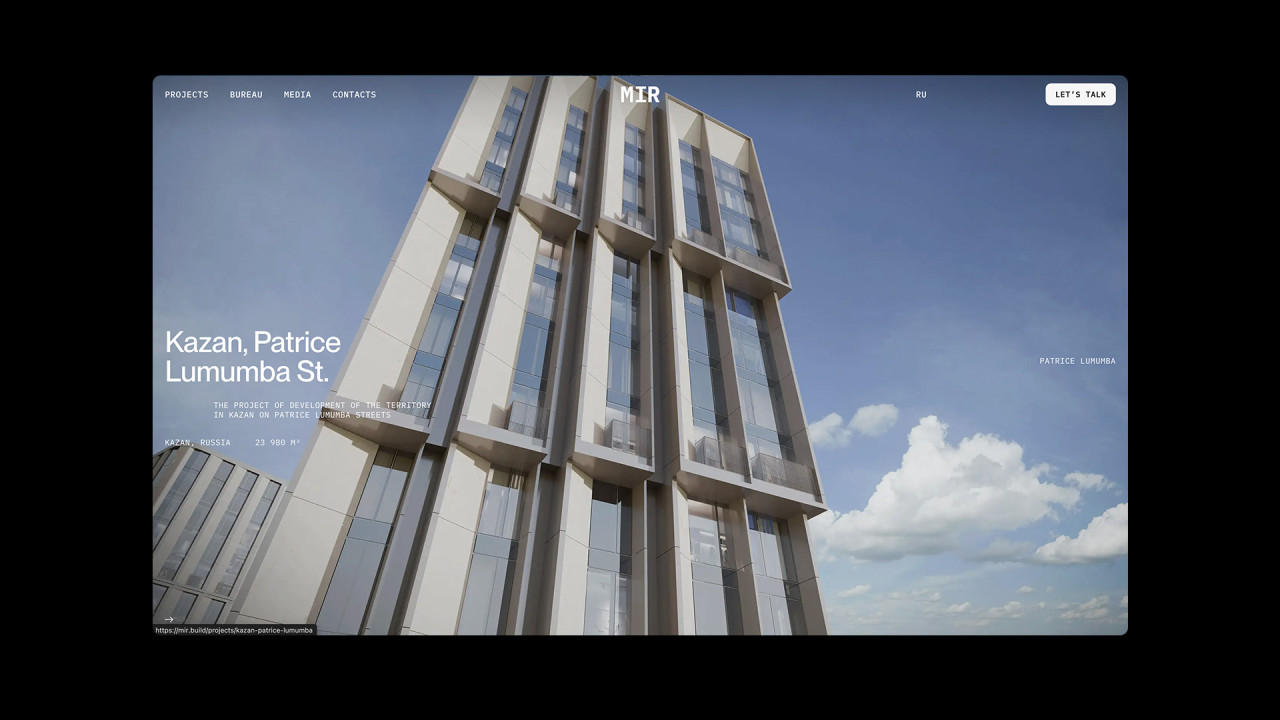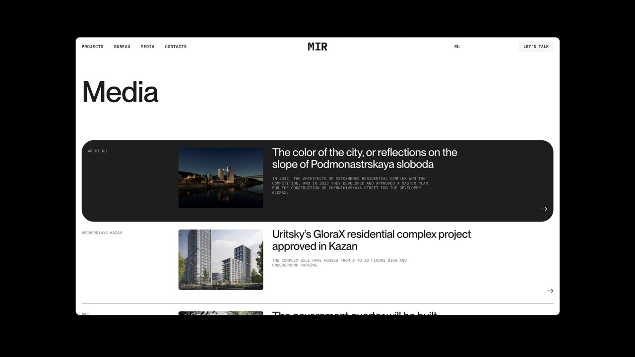 Дизайн и разработка сайта архитектурного бюро MIR, которое специализируется на крупных проектах, в частности высотных и многофункциональных, а также жилых зданий, офисов и комплексном развитии территорий.