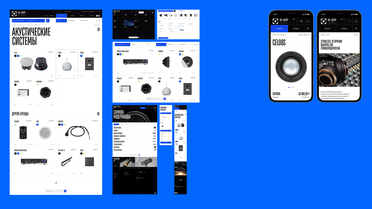 Чёрно-белая палитра, фирменный синий для акцентов, лаконичная типографика, прямые линии и чёткая геометрия. Такой визуал подчеркивает премиальный статус компании и не отвлекает от самой продукции.