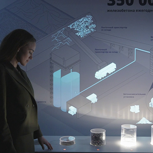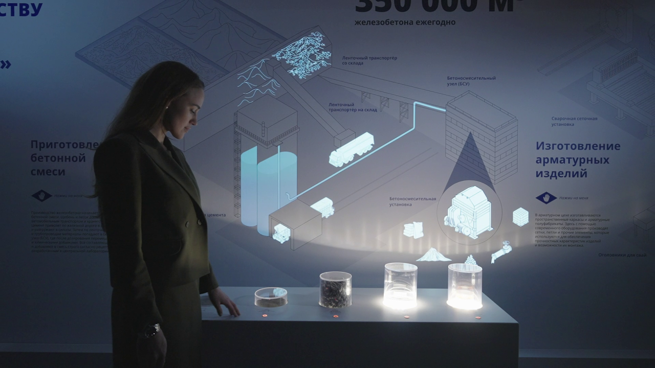 С помощью интерактивной проекции посетитель касается этапов производства, запуская этим действием анимационные ролики. Содержательную часть прорабатывал редактор бюро вместе с техническими специалистами завода.