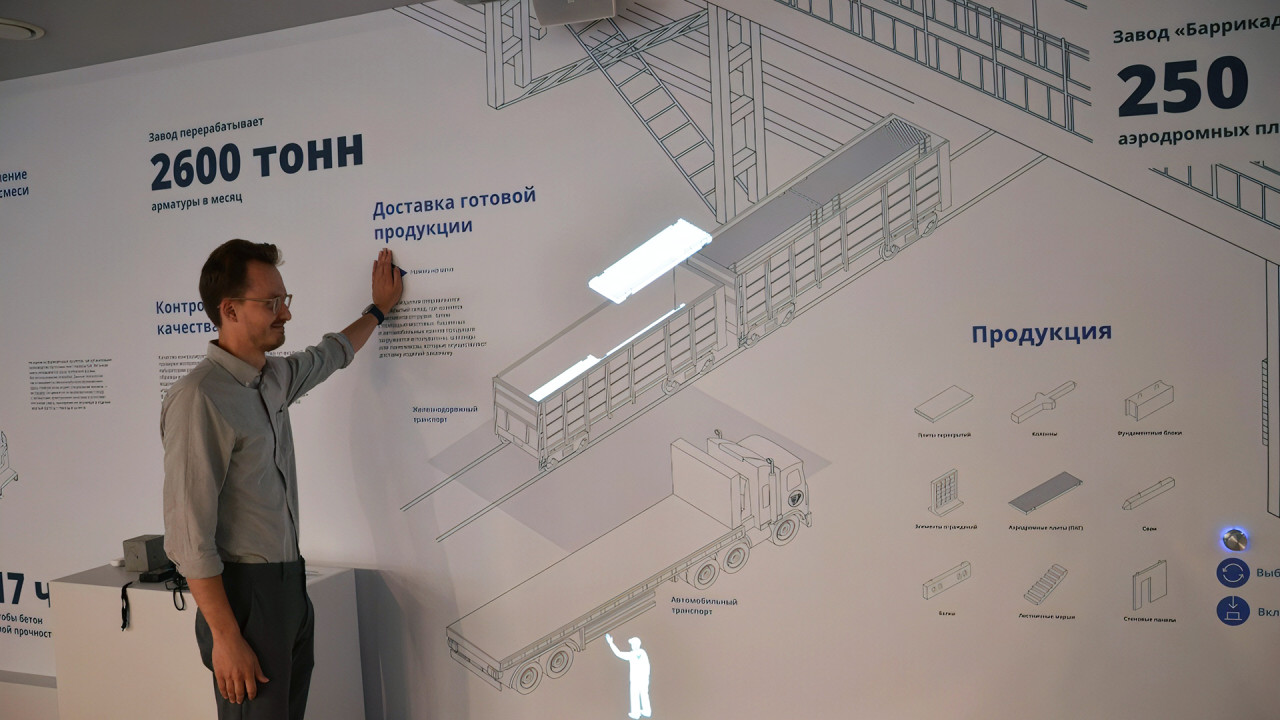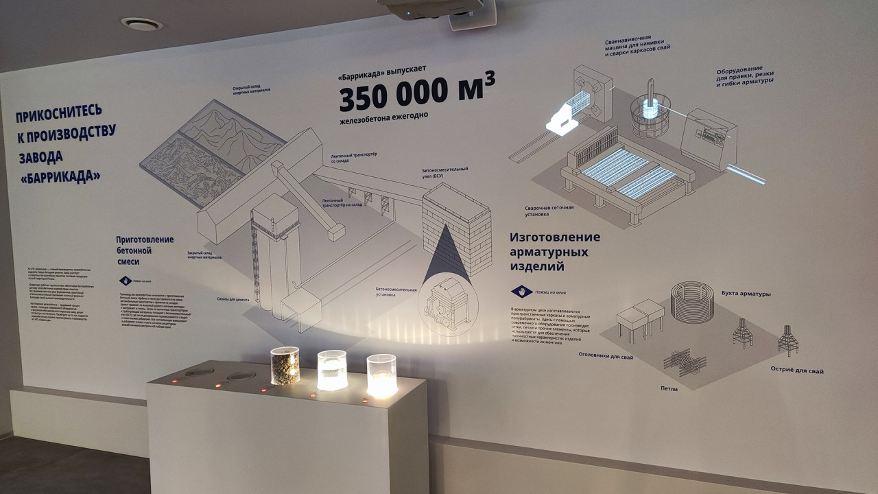 Одна из привлекающих внимание инсталляций нового интерактивного шоу-рума завода «Баррикада» — «Прикоснитесь к производству»: интерактивная инфографика, сопровождаемая анимацией и механическими экспонатами.
