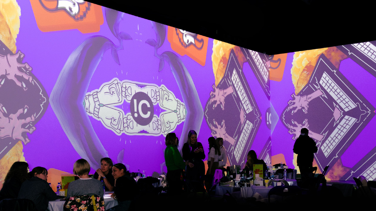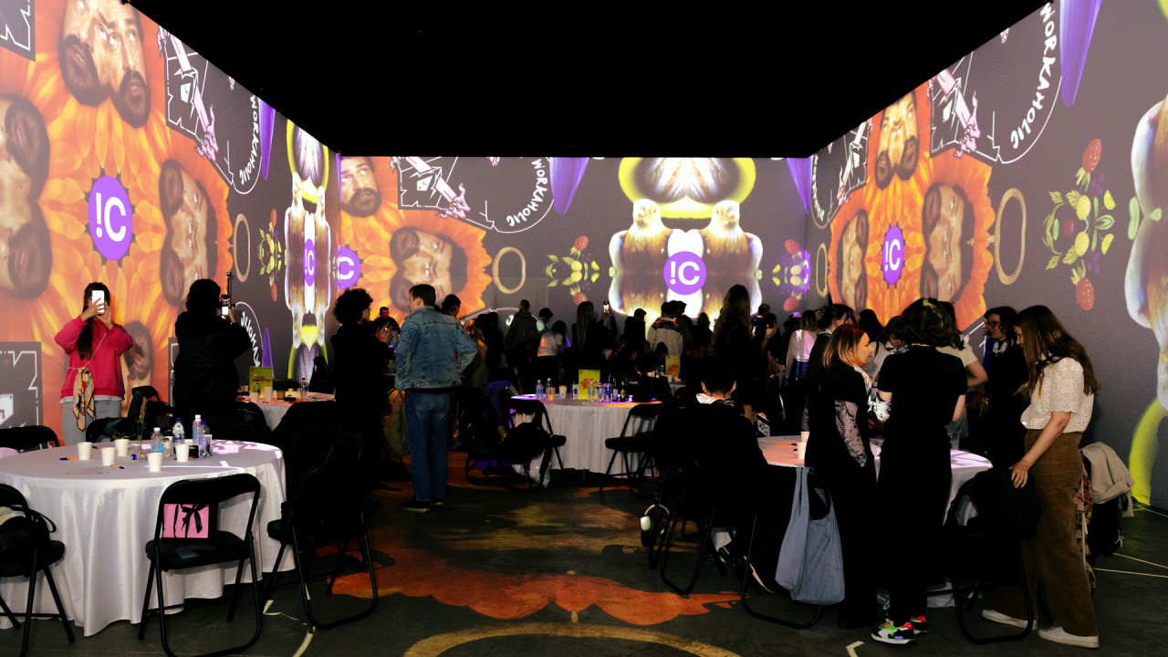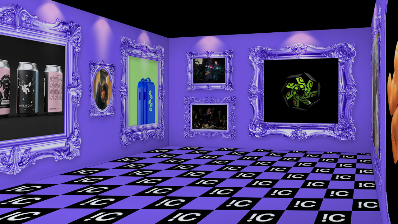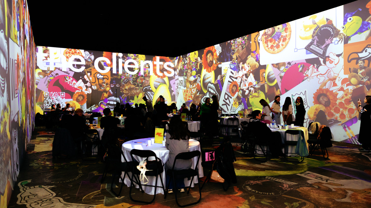 Поэтому нашим основным челленджем стало создание нескучного интерактивного видео-арта на основе нашего портфолио. Именно так родилась идея, иронизирующая над популярными выставками «оживших полотен». Мы буквально превратили пространство в галерею, где в каждой из рам — ожившие, словно портреты из Гарри Поттера, работы. Для следующей интеграции мы создали гипнотизирующие психоделические узоры на основе все тех же кейсов. Для третьей — использовали «стикербомбинг», покрыв все пространство от пола до потолка мемами из наших проектов. Этот прием повторяет главную страницу нашего сайта. И, наконец, в последнем блоке стены превратились в интерактивную витрину нашего бренда мерча — FIOLETOVO, что стало идеальным фоном для его раздачи для участников лотереи.