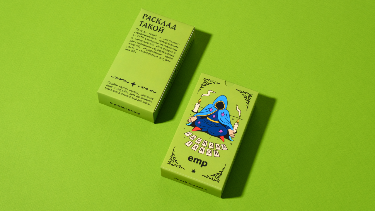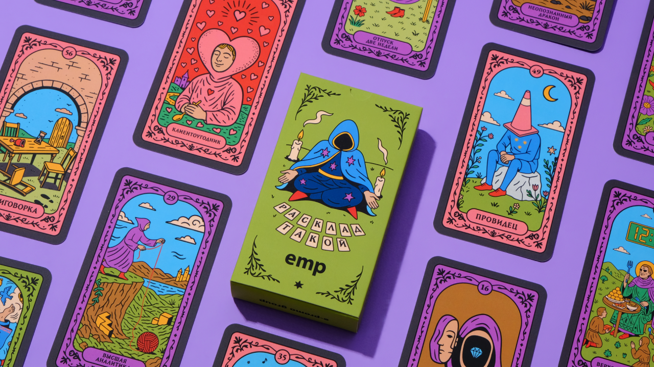 EMP помогает компаниям расти: масштабирует команды под задачи клиентов, автоматизирует рутину своими разработками и подключает людей в проект за полторы недели. Для них мы придумали мерч, который будет говорить не корпоративным жаргоном, а шуткой и метафорой. Это колода карт про офисную реальность.