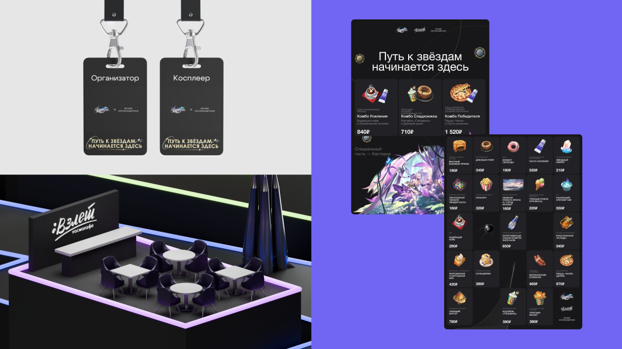 После квеста игроки отправлялись в кафе «Взлёт». Для него мы сделали оформление и тематическое меню — с блюдами, стилизованными под предметы из игры. Вот так Honkai и Музей космонавтики соединились в одном космическом приключении на ВДНХ.