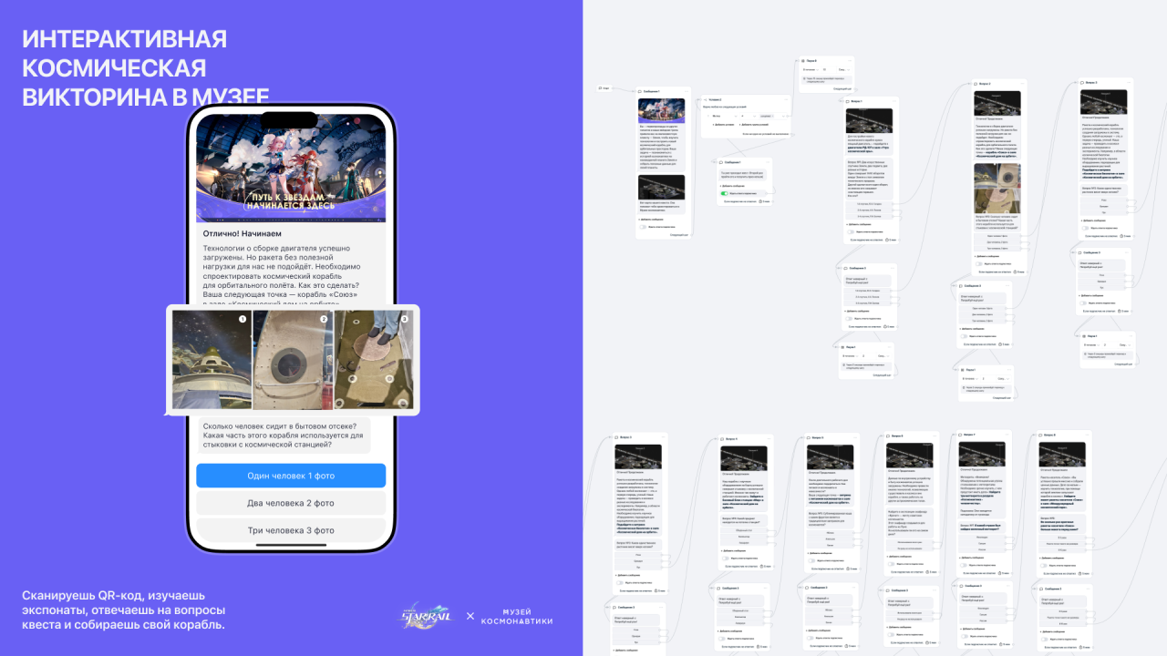 Квест проходил в телеграм-боте, который мы разработали. Для него вместе с музеем подготовили вопросы об экспонатах. В боте игроки получали подсказки, выполняли задания и, по мере прохождения, собирали детали космического корабля. Всего интерактивный маршрут прошли более 3 000 участников прямо в музее, а сайт мероприятия посетили 35 615 человек.