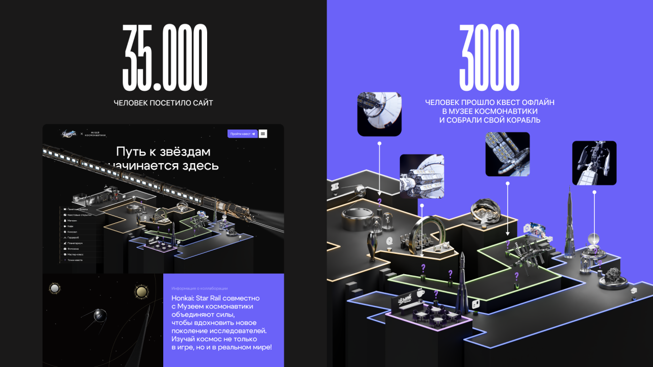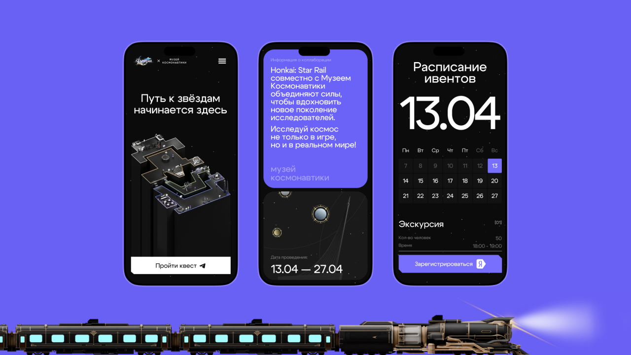 Цель проекта — создать событие, которое будет не просто квестом, а запоминающимся опытом взаимодействия бренда и аудитории, объединяющим фанатов игры и интересующихся космосом посетителей музея. В итоге концепция соединилась в навигации и на главном экране сайта, где мы замоделировали большую карту музея в 3D с основными экспонатами, а ещё взяли фирменный «Звёздный Экспресс» из игры, который буквально доставляет игроков ко входу в музей.