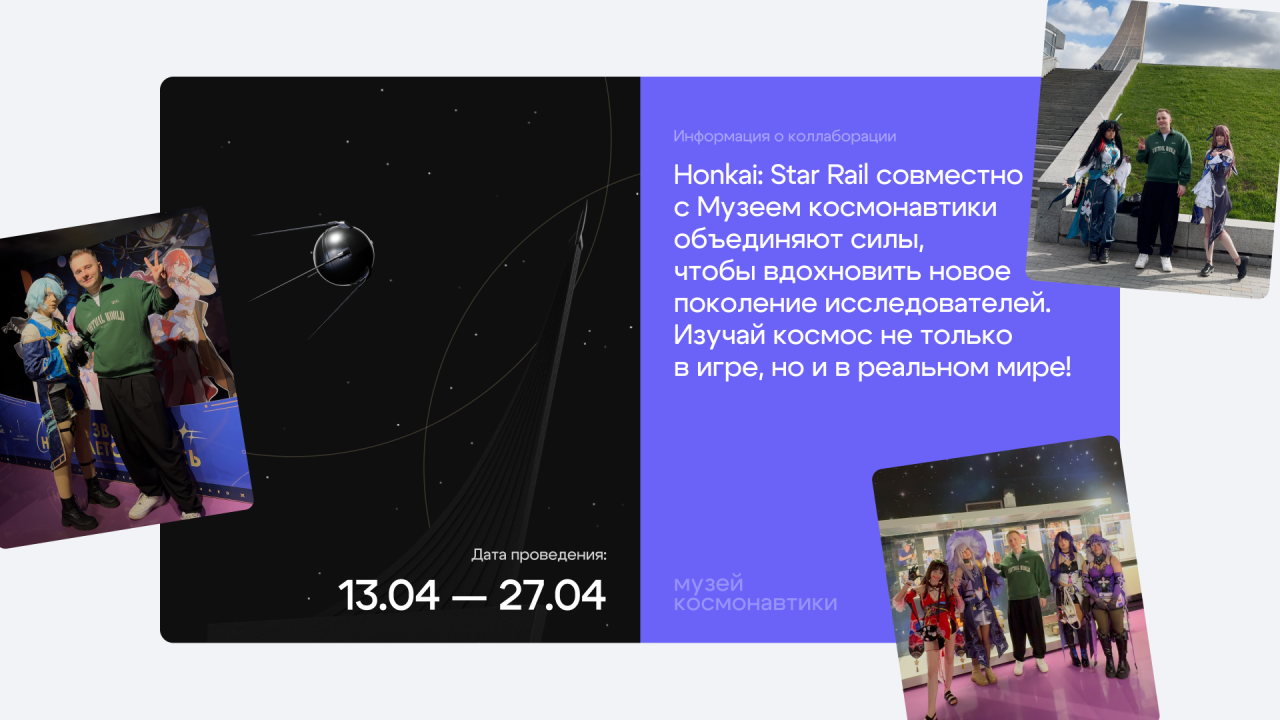 Ко Дню космонавтики игровой бренд Honkai: Star Rail и Музей космонавтики в Москве решили объединить аудиторию игр и науки. Мы сделали для них интерактивный квест прямо в музее, промо-сайт, мерч для участников события, фотозону и айдентику ивента.