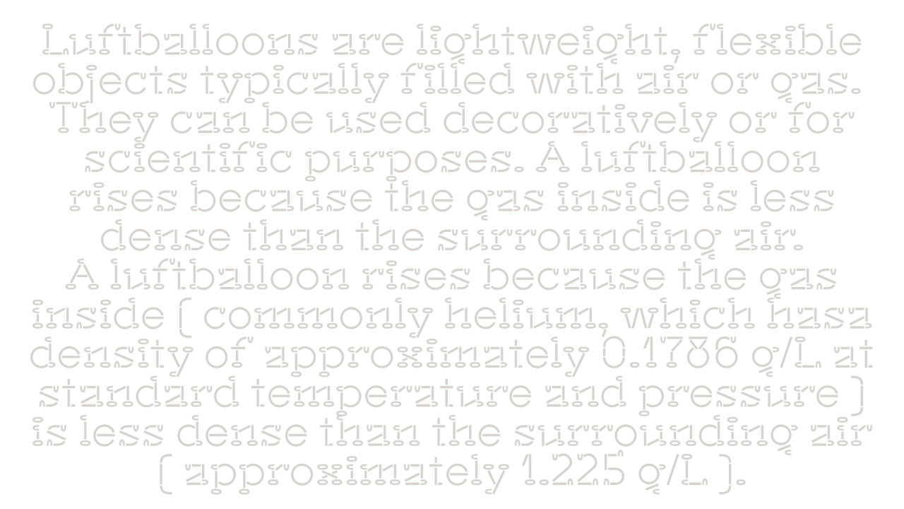 Время от времени дизайнер Владимир Коломейцев присылает в телеграм-чат Playfaces надпись и предлагает участникам сделать леттеринг на её основе. С одной из таких надписей и начался шрифт Lufta. Унаследовав от прототипа только необычную форму засечек, он превратился в дружелюбную и почти трафаретную брусковую антикву, которая будет одинаково хорошо работать и на светоотражающих патчах для одежды, и в айдентике deep-tech стартапа, и в DIY-проектах (например, навигации по гаражной распродаже). В Lufta — три начертания: технологичное Normal, тёплое Rounded и напоминающее типографику музыкальных обложек 70-х — Doubled. Шрифт поддерживает расширенные латиницу и кириллицу (в том числе болгарскую), а ещё в нём два набора цифр.