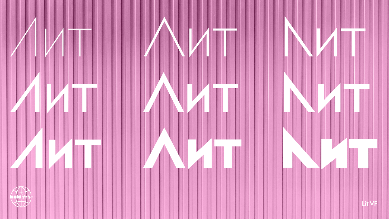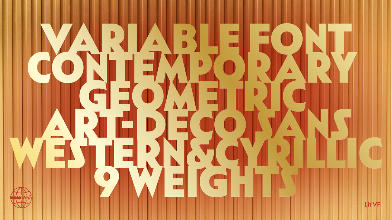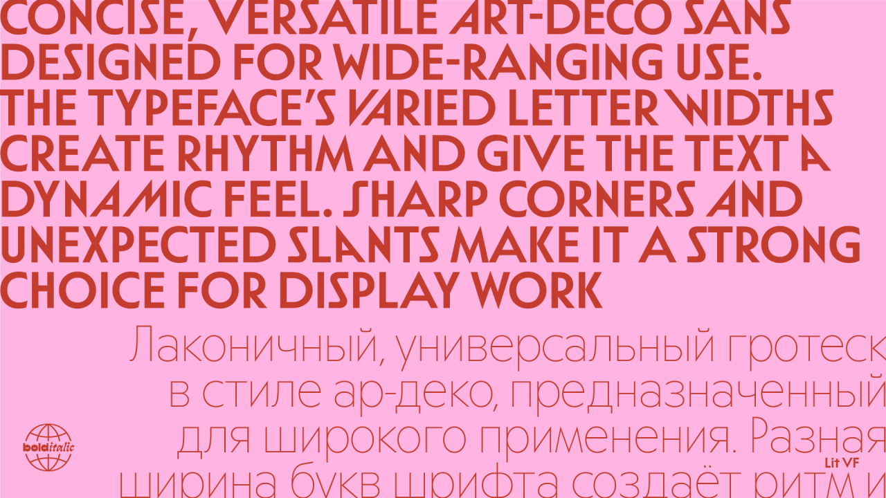 Лаконичный, универсальный гротеск в стиле ар-деко, предназначенный для широкого применения. Разная ширина букв шрифта создаёт ритм и придаёт тексту динамичность. Острые углы и неожиданные наклоны делают его отличным выбором для оформления.