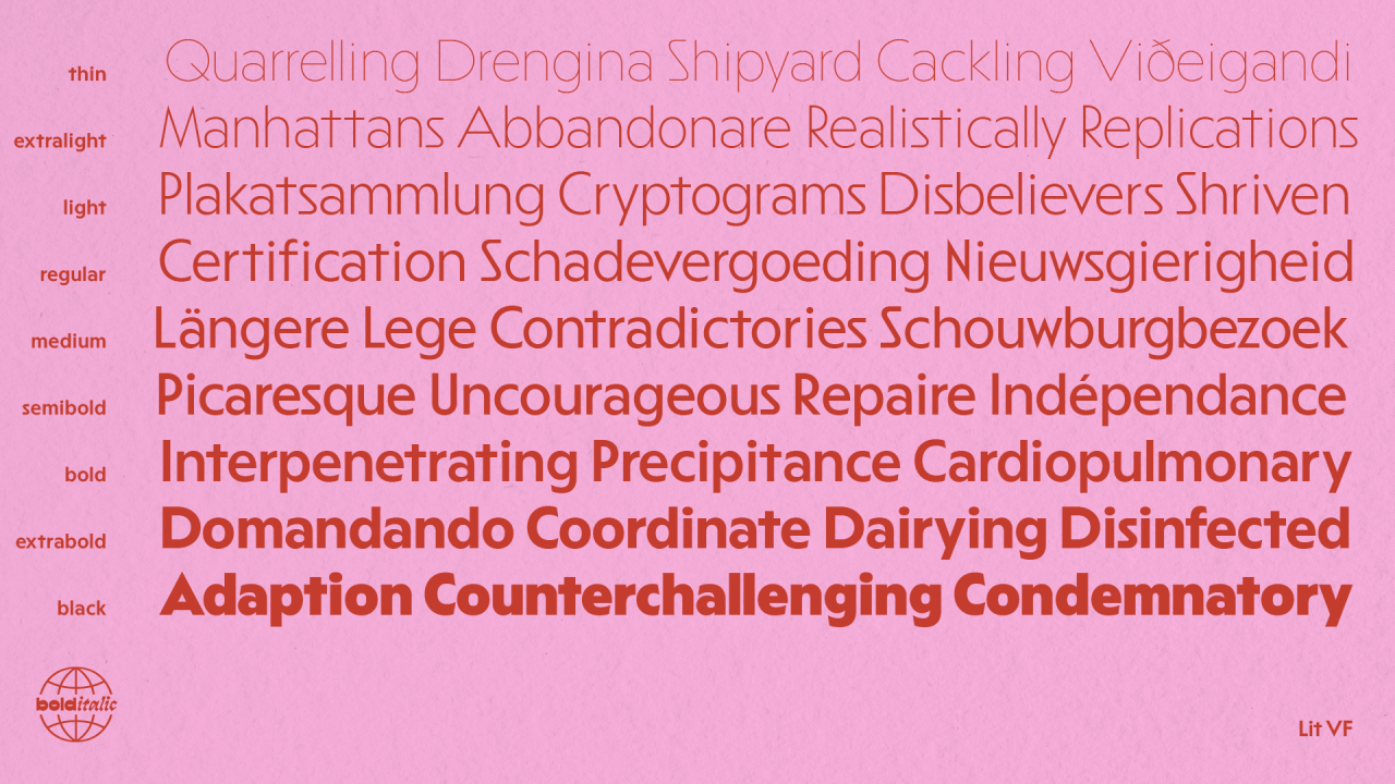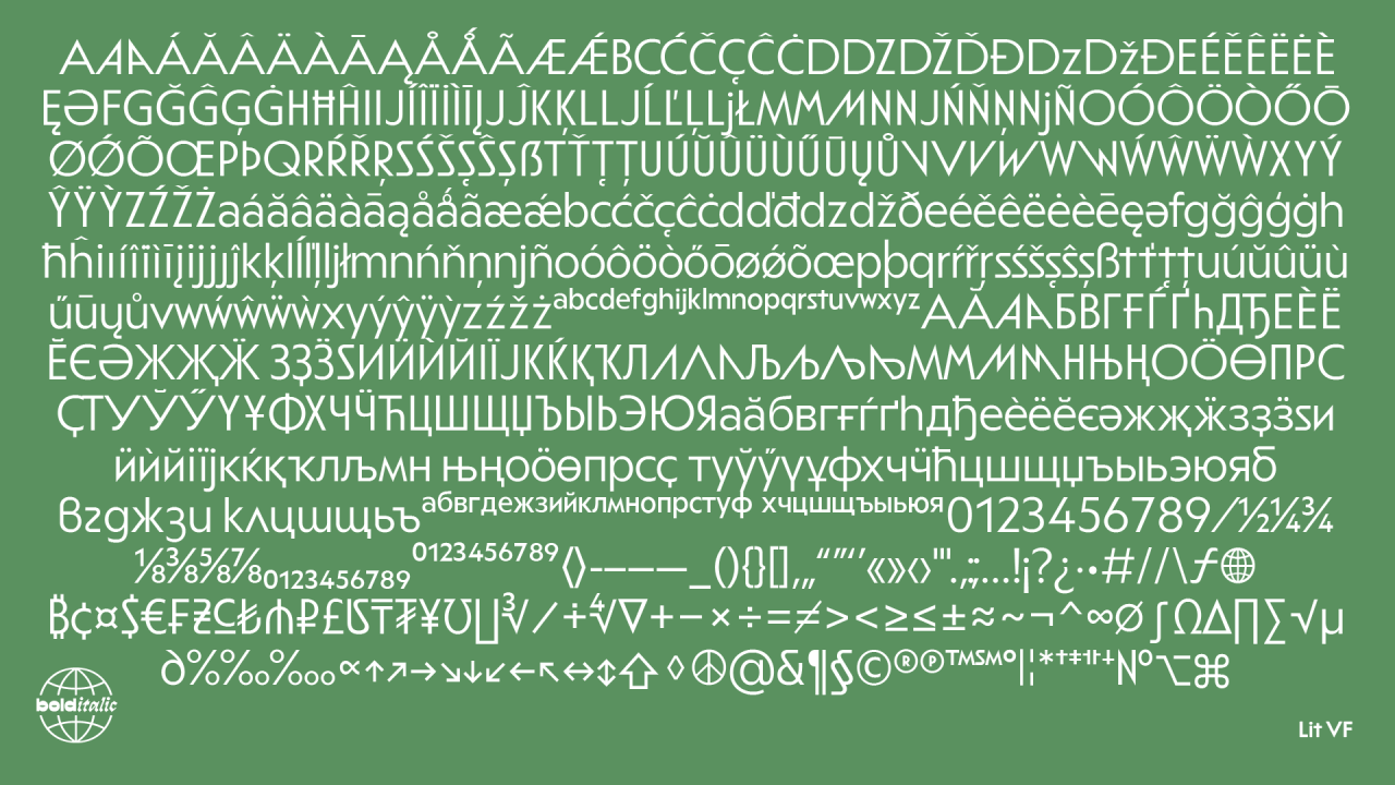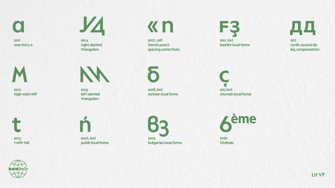У шрифта есть довольно большой диапазон начертаний по насыщенности (+ вариативный формат) и внушительный знаковый состав: языки Западной Европы и народов России + много альтернатив.
