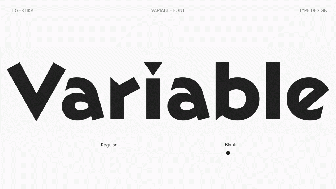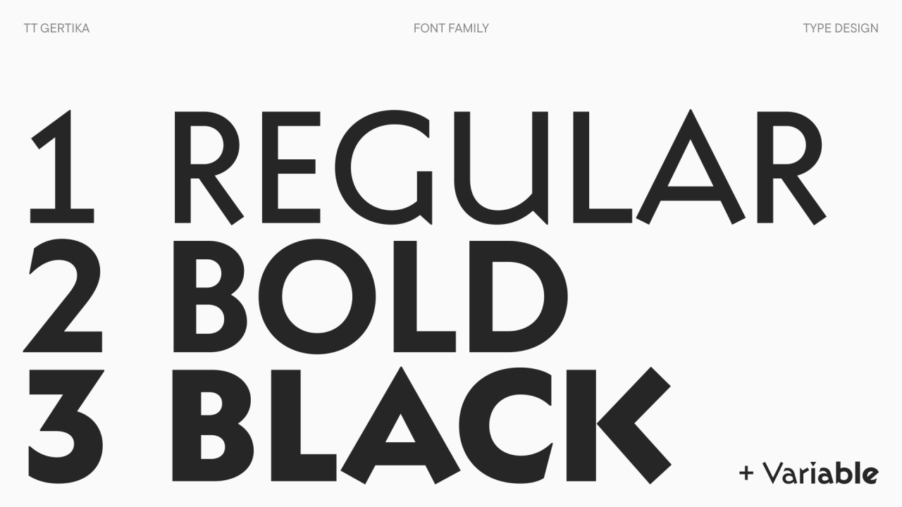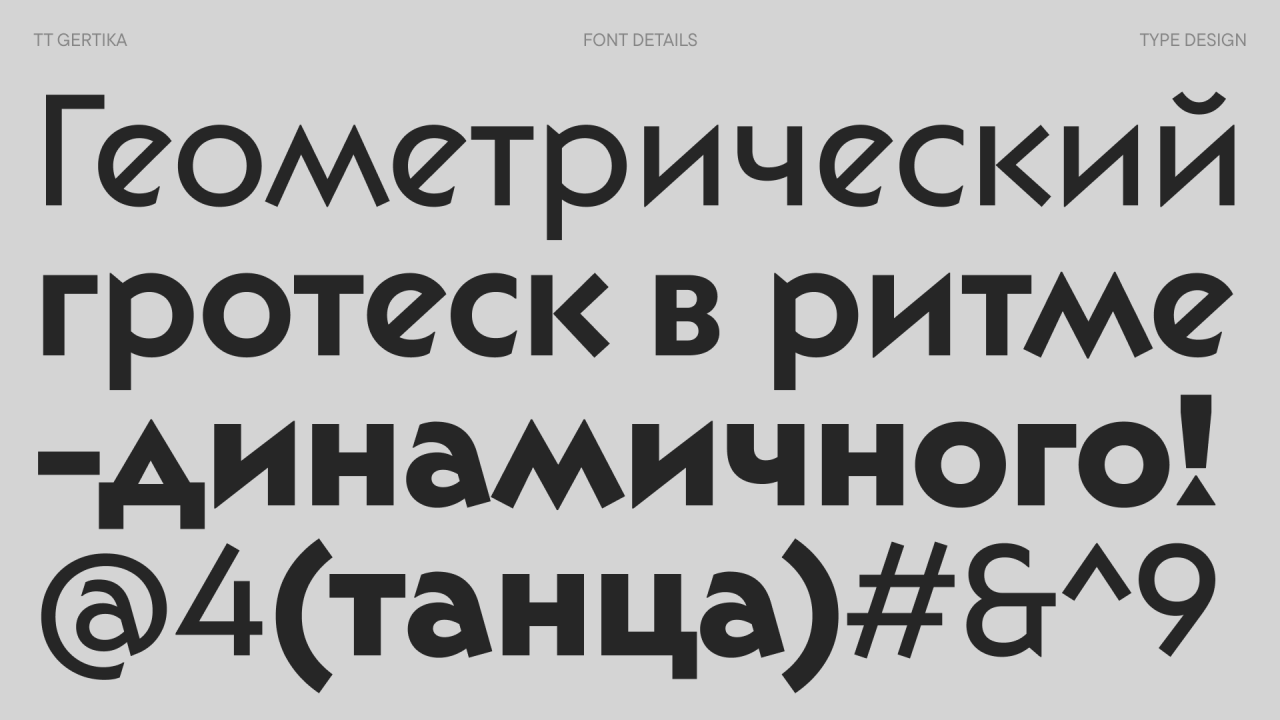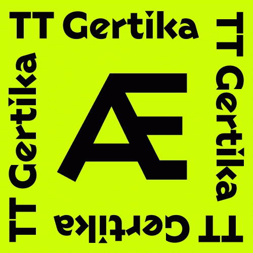 TT Gertika — геометрический гротеск с танцующим ритмом, в котором удивительным образом сочетаются архаичная мощь и современная динамика. Идея его создания зародилась из леттеринга на американском плакате 30-х годов.
