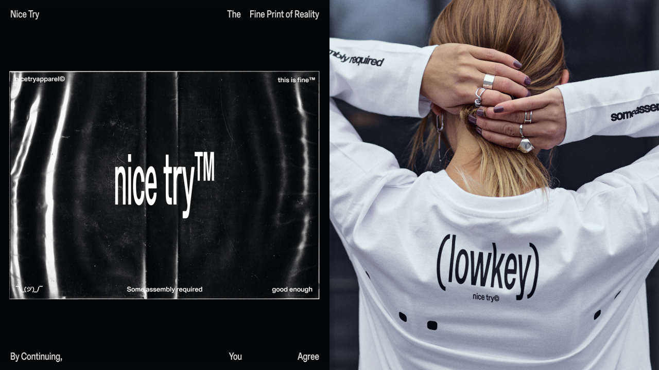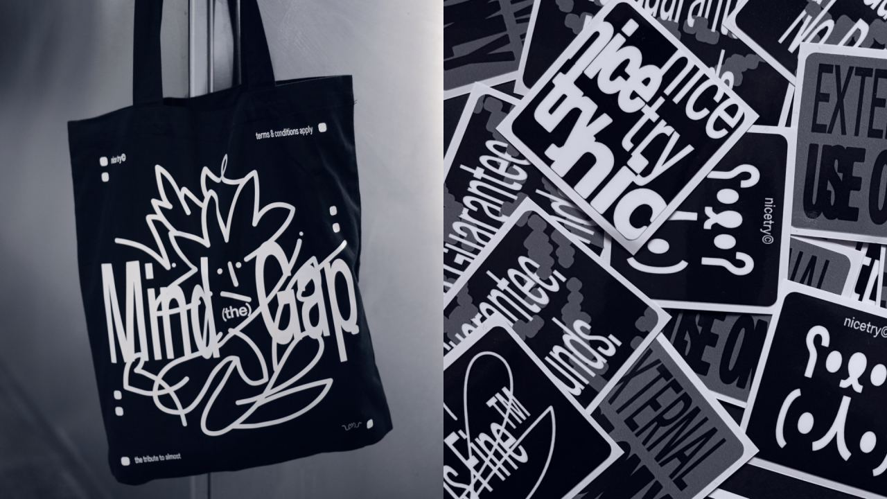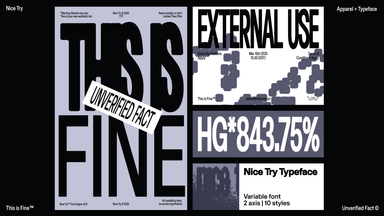 Nice Try — это не только шрифт. Это визуальный язык, выстроенный на несовершенстве. Грубые, будто незавершённые композиции, пиксели, эскизные линии и текст-арт формируют эстетику, которая будто спрашивает: «так и задумано или просто недоделано?»