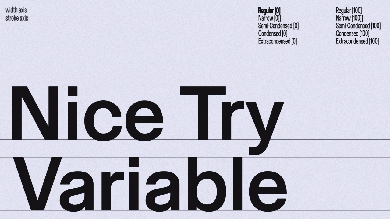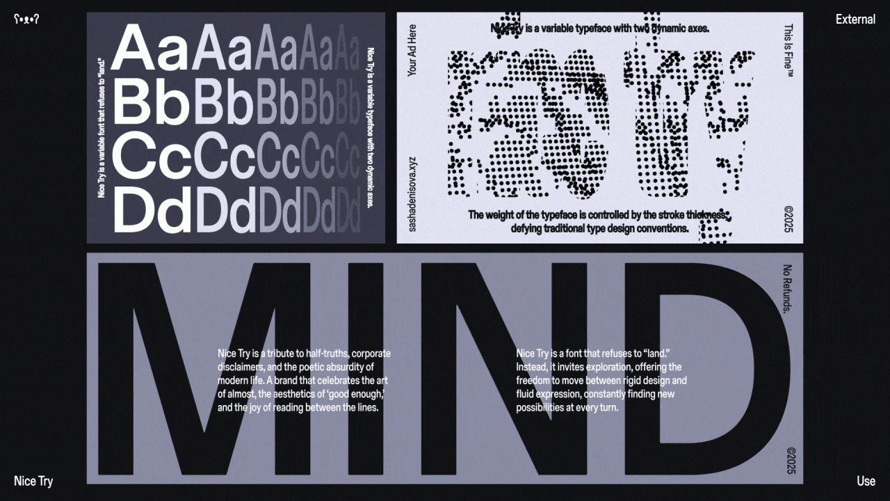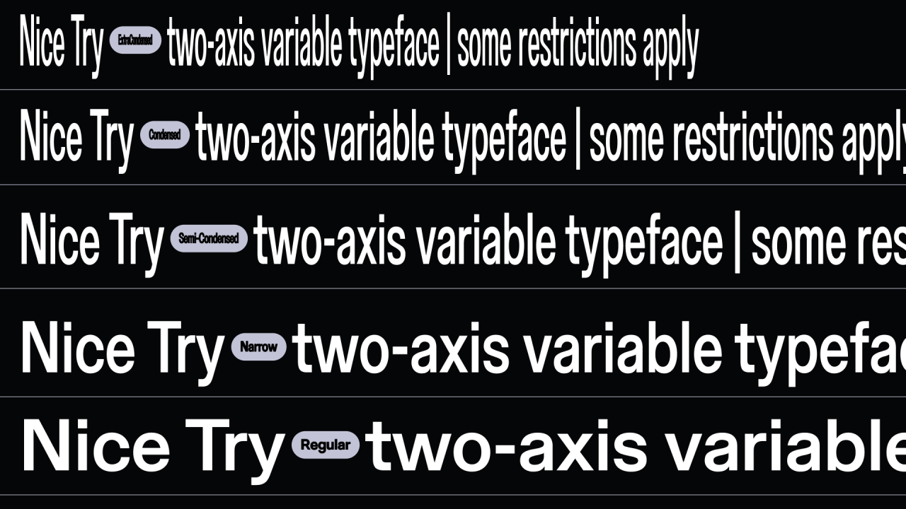 Nice Try — вариативный шрифт с двумя динамическими осями. Он варьируется от узких выразительных форм до вполне себе привычного геометричного гротеска. Жирность определяется толщиной строука — анархия вместо типографических догм.