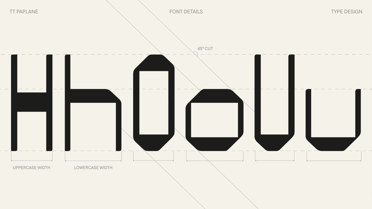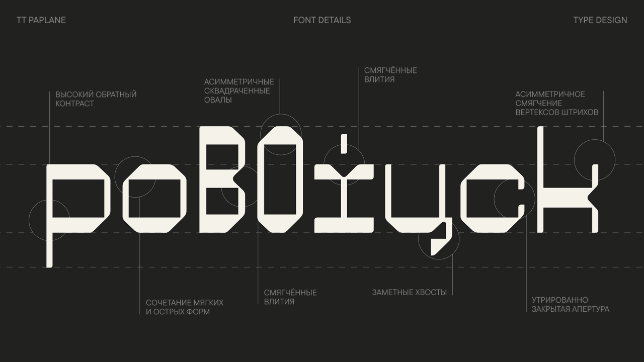 Характерные черты этого шрифта — сквадраченные формы, 45-градусные срезы и обтекаемые внешние контуры, ассиметричные сглаживания вершин штрихов. Разные пропорции строчных и прописных знаков добавляют его характеру игривости, а необычные формы и детали некоторых букв цепляют и привлекают внимание.