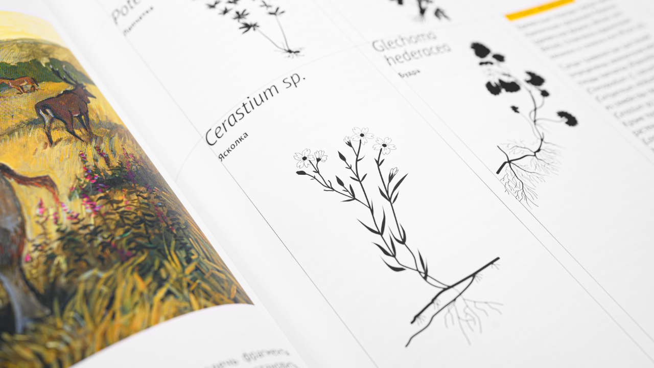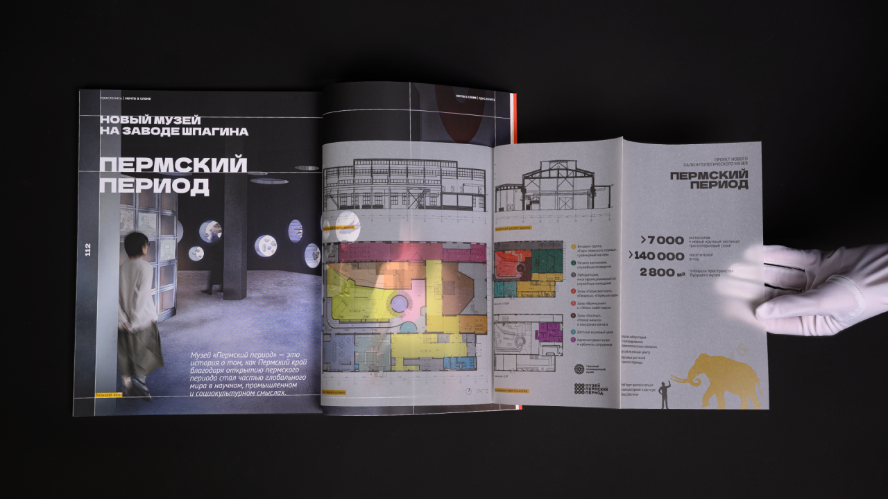 Графические решения усилены полиграфическими приемами, несущими эстетическую и утилитарную функции, — выборочный УФ-лак на обложках создает эффект текстуры объектов, ВД-лак на внутренних страницах делает их прочными и тактильно приятными, калька-калитка с нанесенным планом будущего музея визуализирует процесс открытия «закулисья».