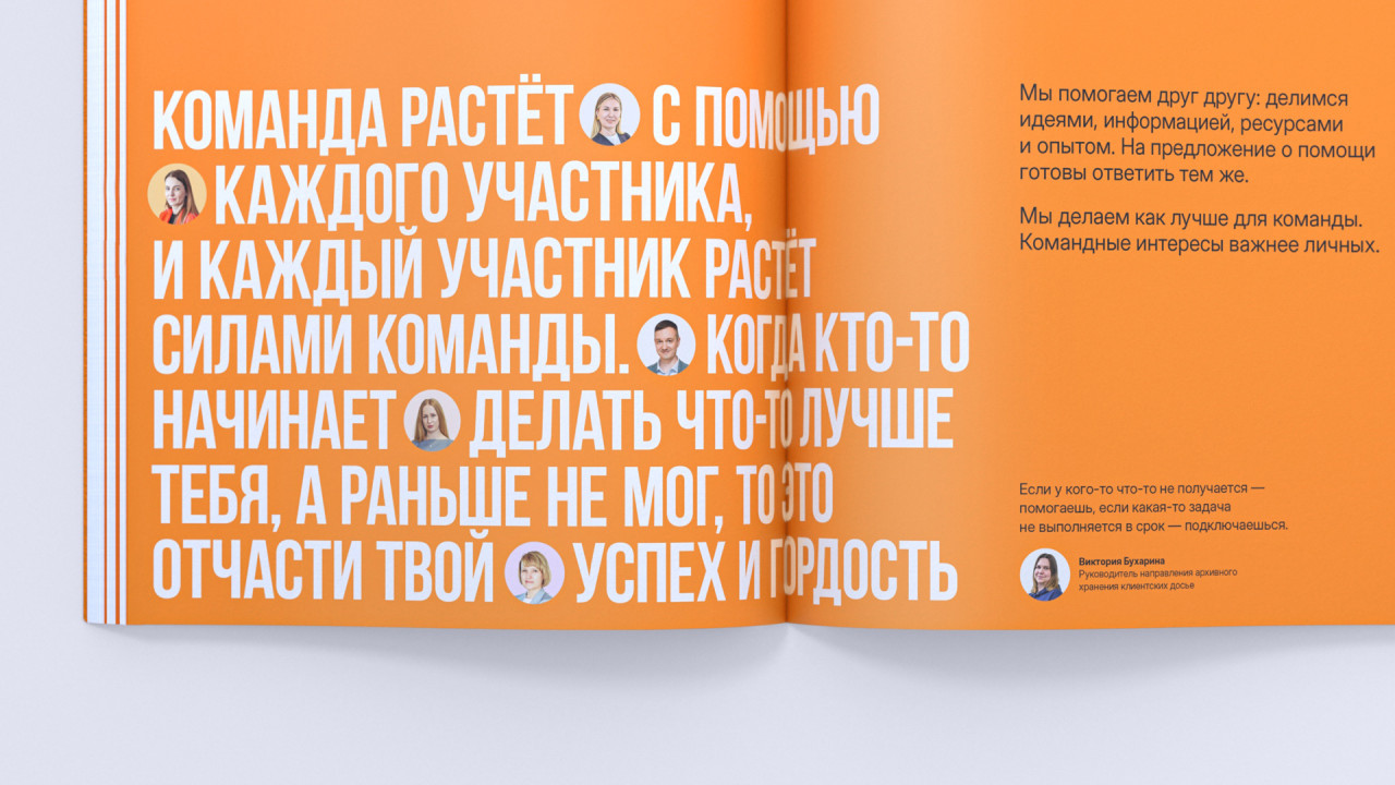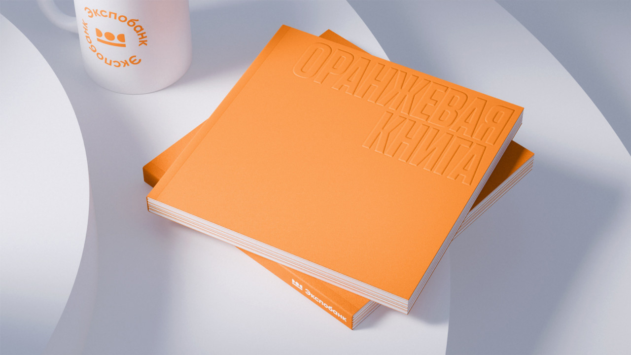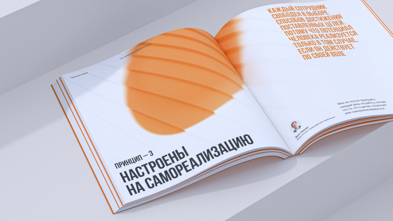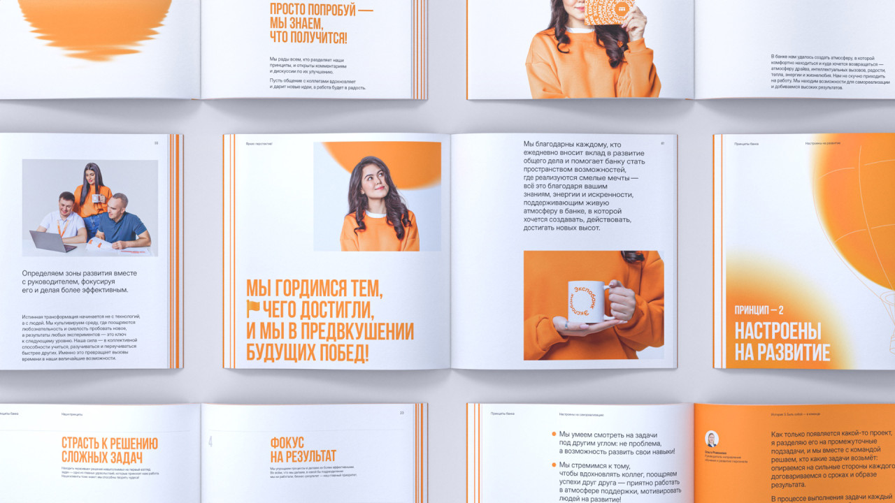 Наша работа над книгой о корпоративной культуре Экспобанка началась с погружения во внутренний мир компании: проведения серии интервью и опросов, участия в тренингах. В ходе исследования мы отметили искреннюю увлеченность и открытость сотрудников разных уровней, огромную роль в их работе играют внутренний настрой и отношения между коллегами — этот инсайт стал отправной точкой для дальнейшей работы. Так появилась идея Оранжевой книги Экспобанка, где оранжевый не просто фирменный цвет бренда — это цвет настроения, отношения, радости и жизнелюбия. Это раз.