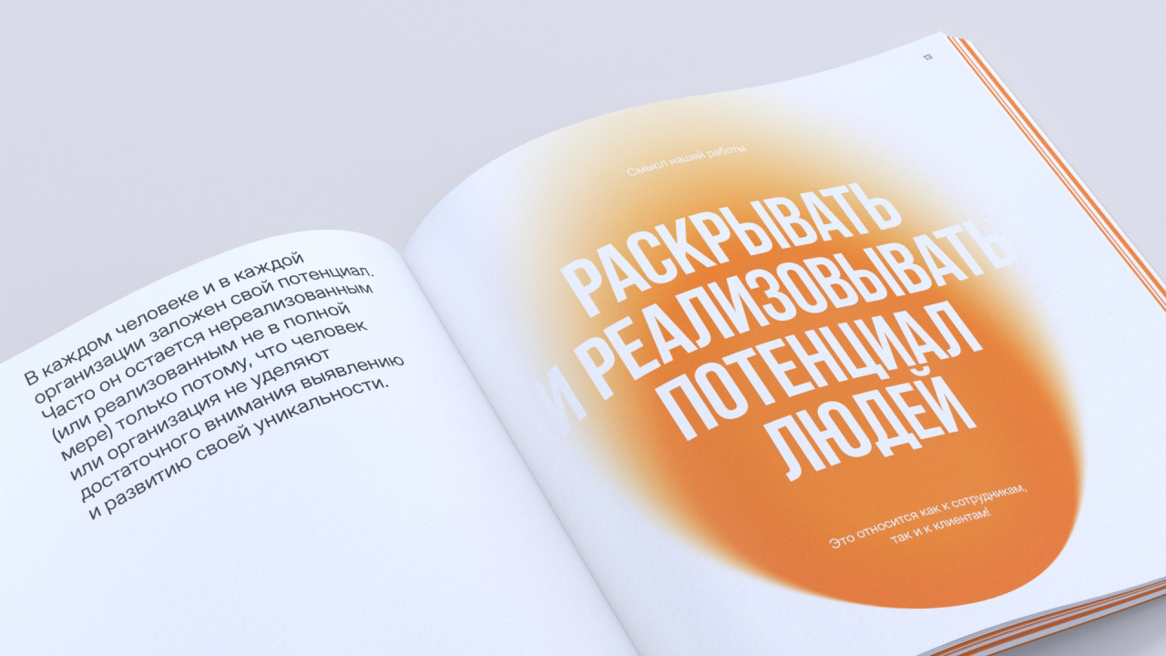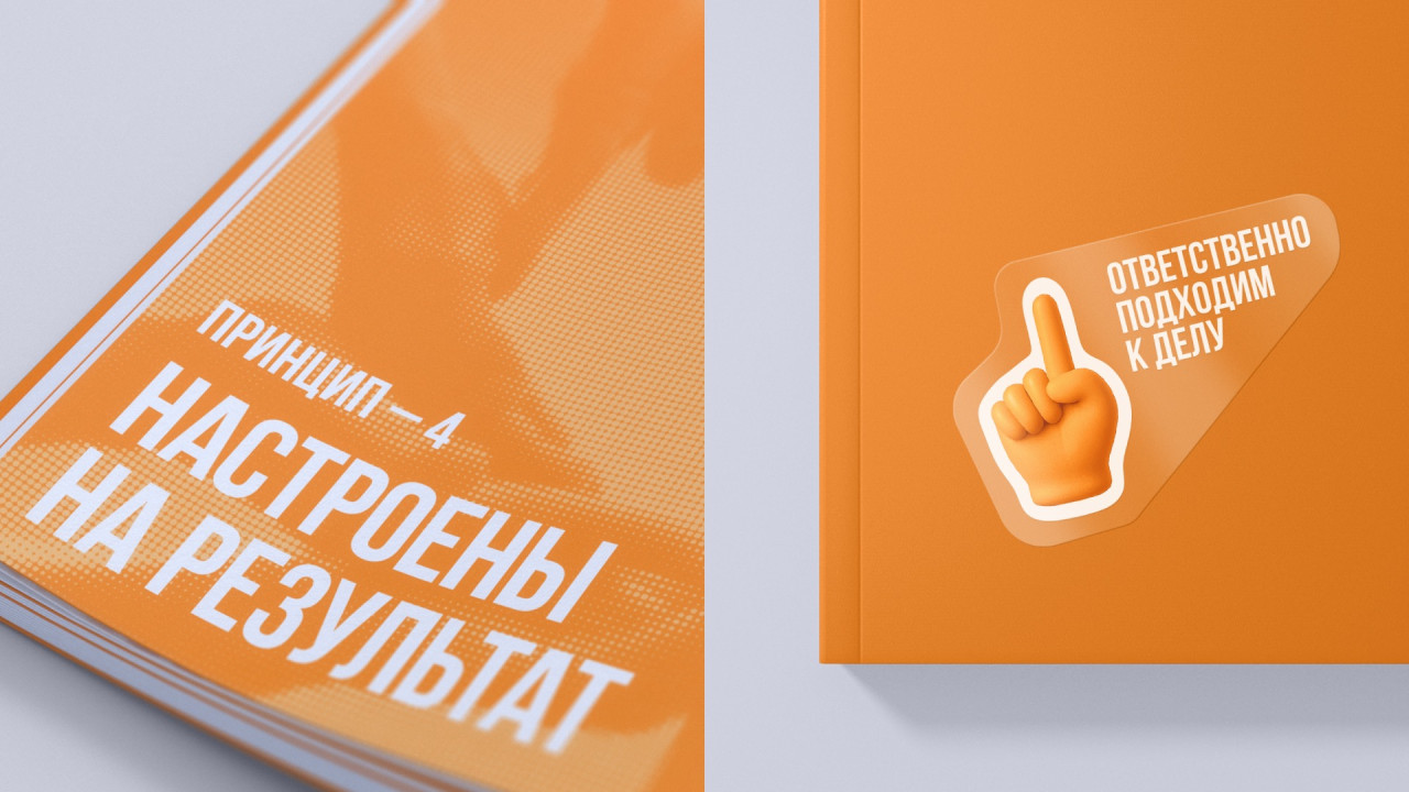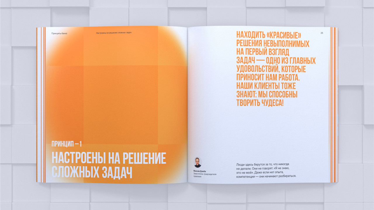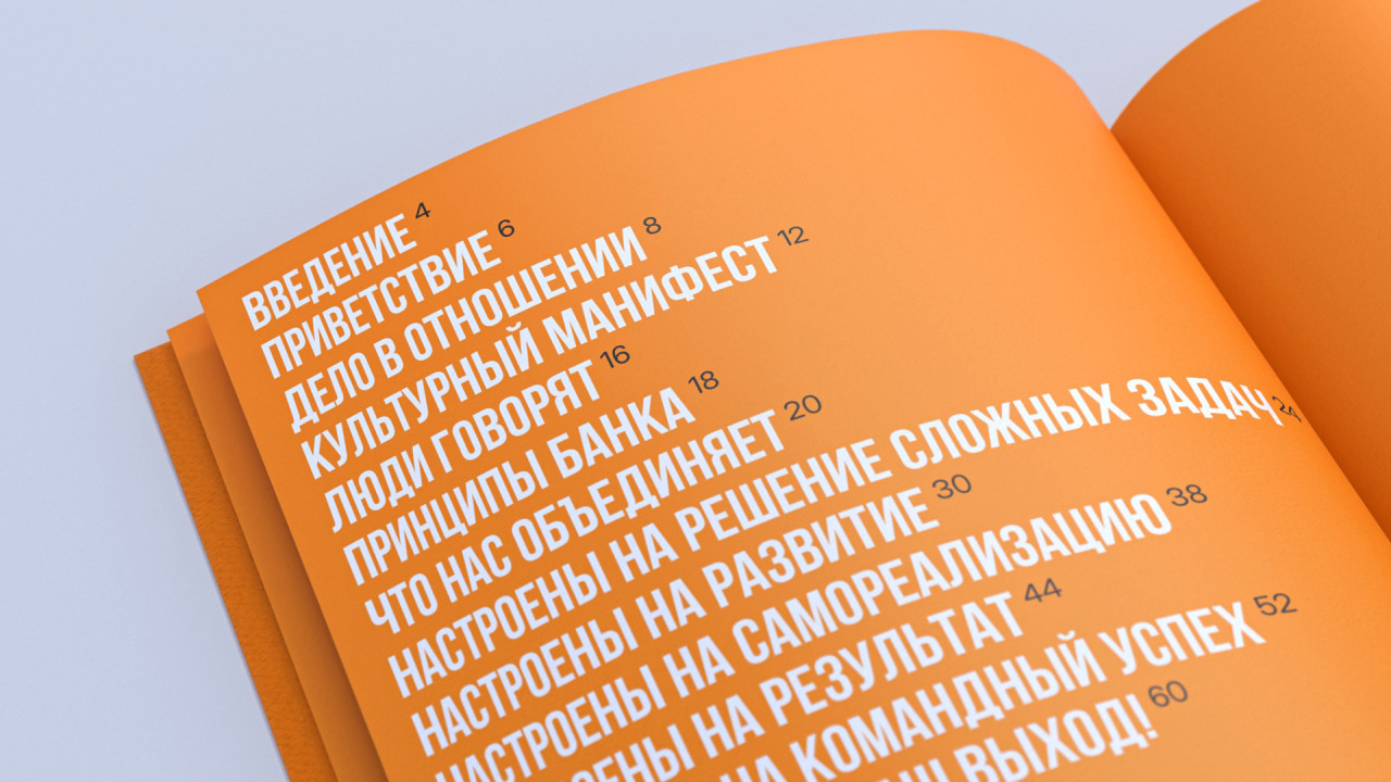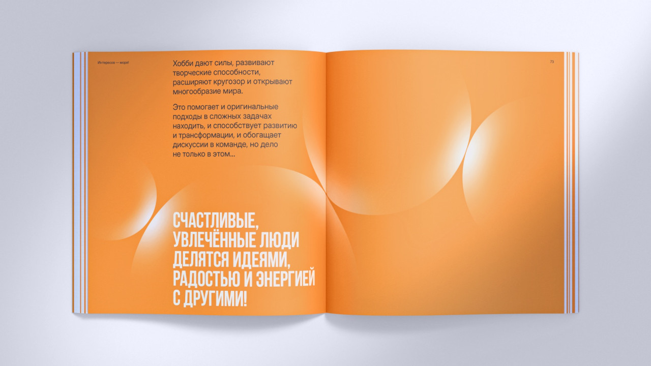 Наша работа над книгой о корпоративной культуре Экспобанка началась с погружения во внутренний мир компании: проведения серии интервью и опросов, участия в тренингах. В ходе исследования мы отметили искреннюю увлеченность и открытость сотрудников разных уровней, огромную роль в их работе играют внутренний настрой и отношения между коллегами — этот инсайт стал отправной точкой для дальнейшей работы. Так появилась идея Оранжевой книги Экспобанка, где оранжевый не просто фирменный цвет бренда — это цвет настроения, отношения, радости и жизнелюбия. Это раз.