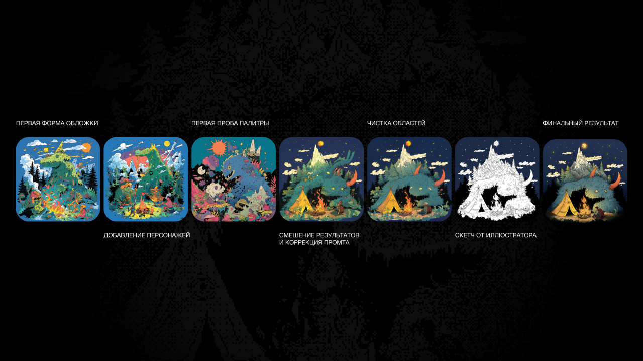 Мы обучили нейросеть на лучших референсах, получили первые прототипы, доработали их вручную и передали иллюстратору, который добавил финальные штрихи и гармонию цвета.