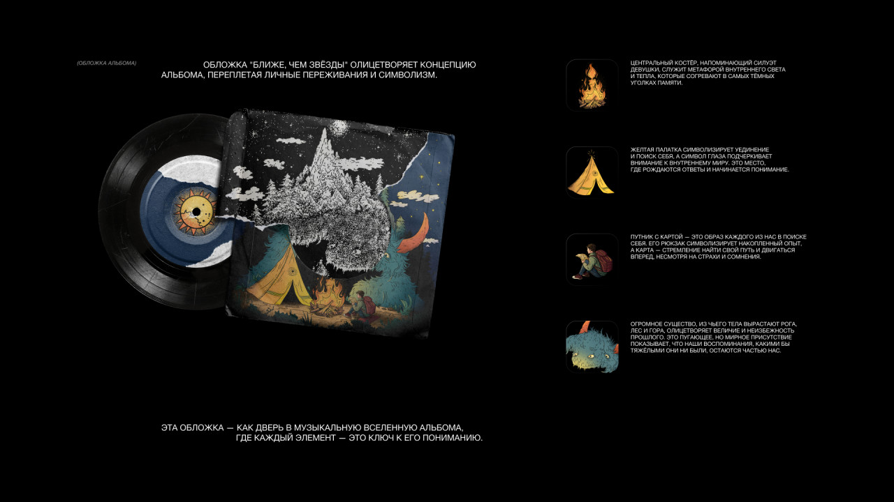 Проект объединяет музыку и визуальный стиль в многослойную вселенную, где каждый элемент — от звука до печатного носителя — создаёт единый опыт восприятия альбома.