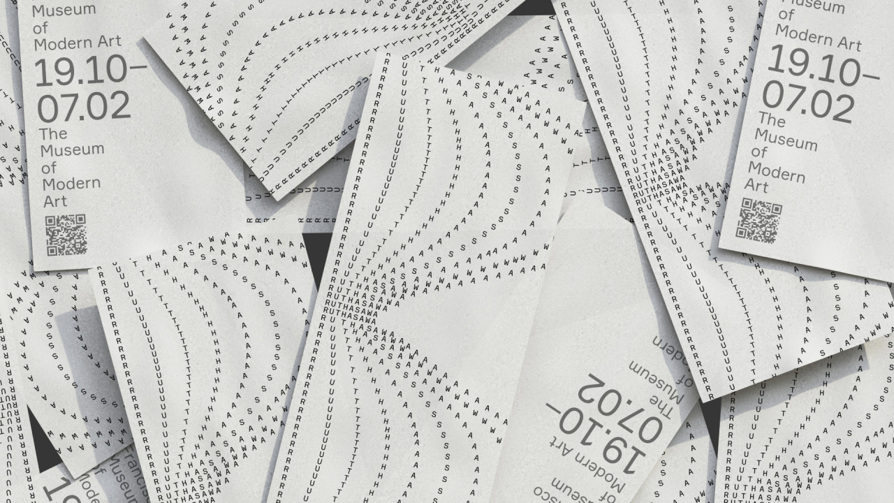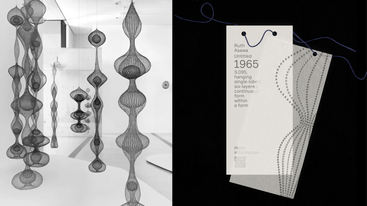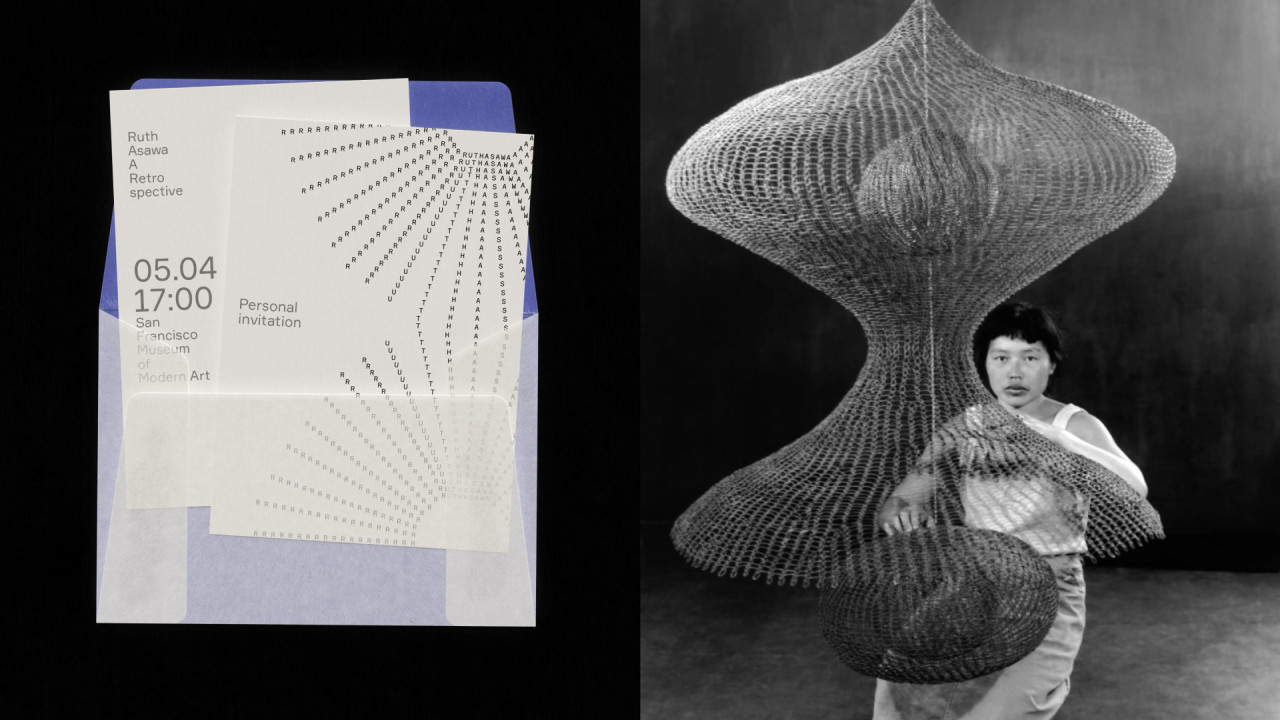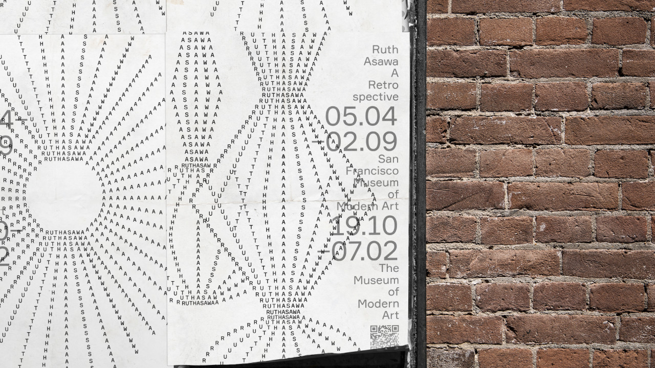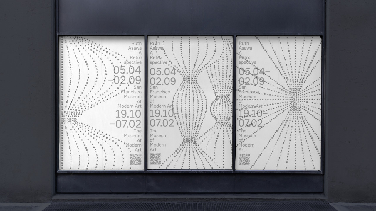 Выставка посвящена Рут Асаве — японско-американской художнице и скульпторке. Для создания айдентики были выбраны свежие выставки, на которых будут представлены её работы: в Сан-Франциско и Нью-Йорке.