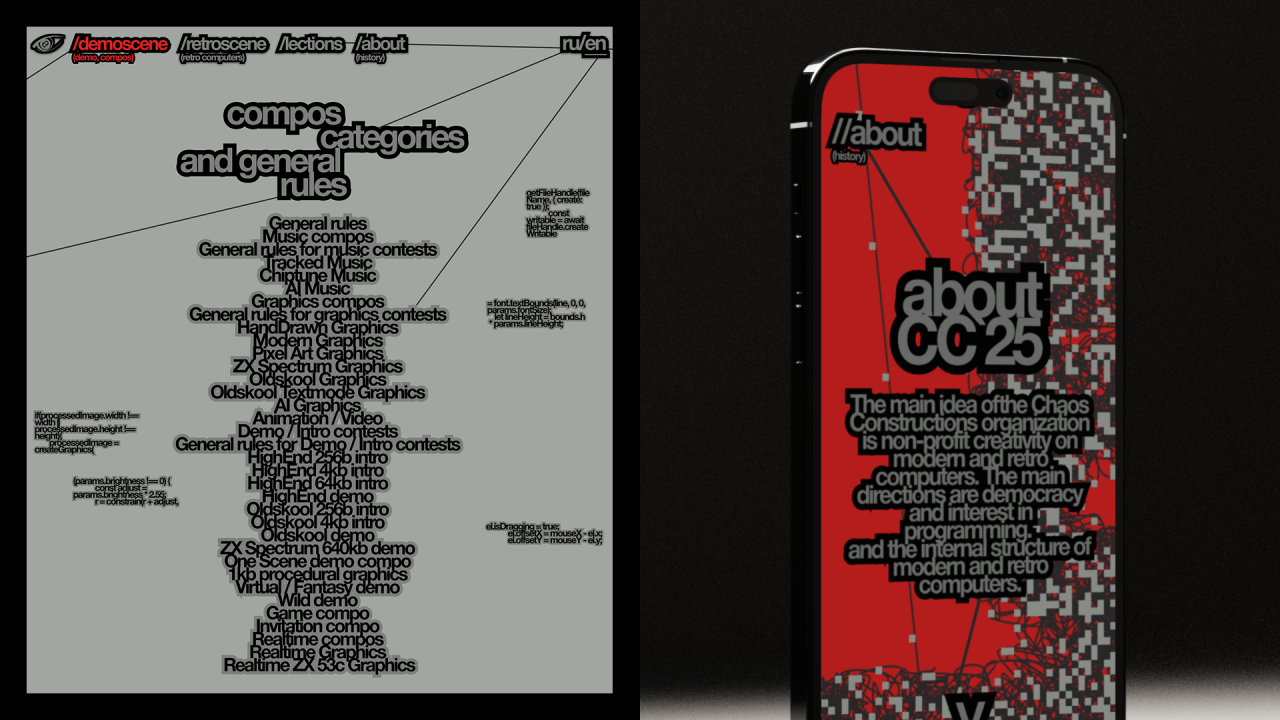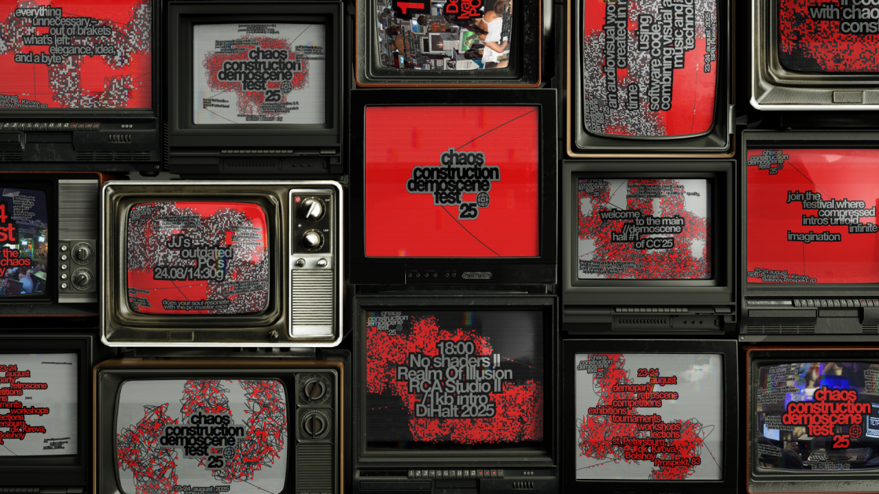 Фестиваль Chaos Constructions — некоммерческое творчество на современных и ретро компьютерах. Основными направлениями являются демосцена и интерес к программированию, внутреннему устройству современных и ретро-компьютеров. Хаос — создание чего-то нового из пустоты. Также и программисты создают искусство лишь с помощью кода. Вся графика формируется вокруг основной идеи и метафоры «искусство цифрового хаоса».