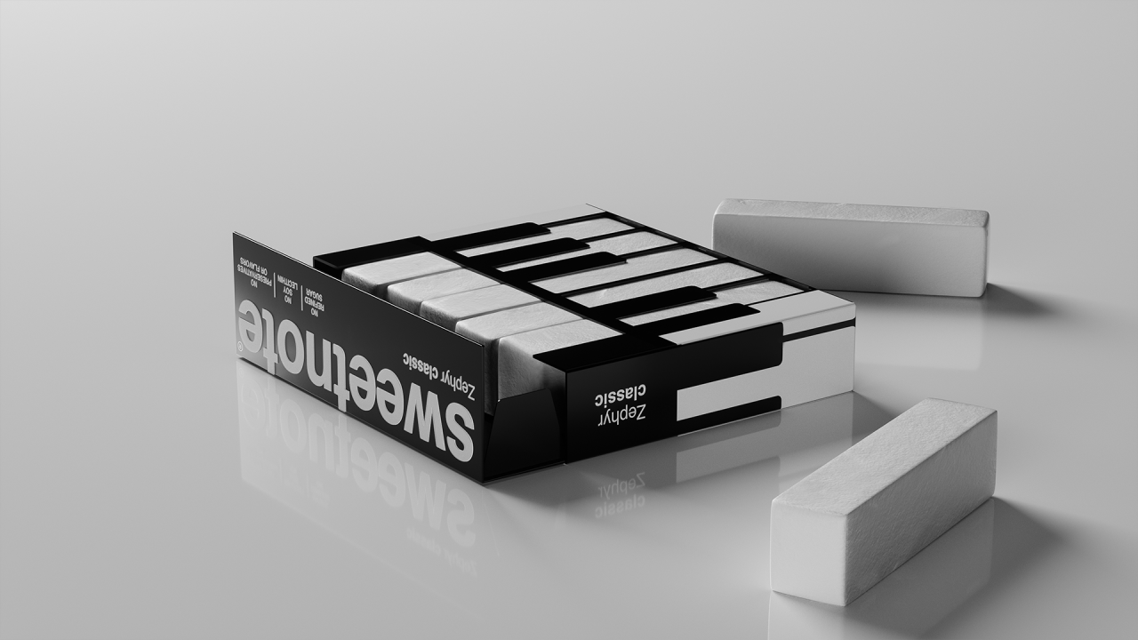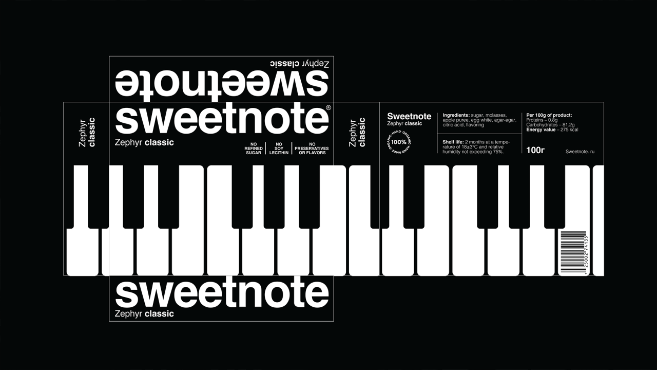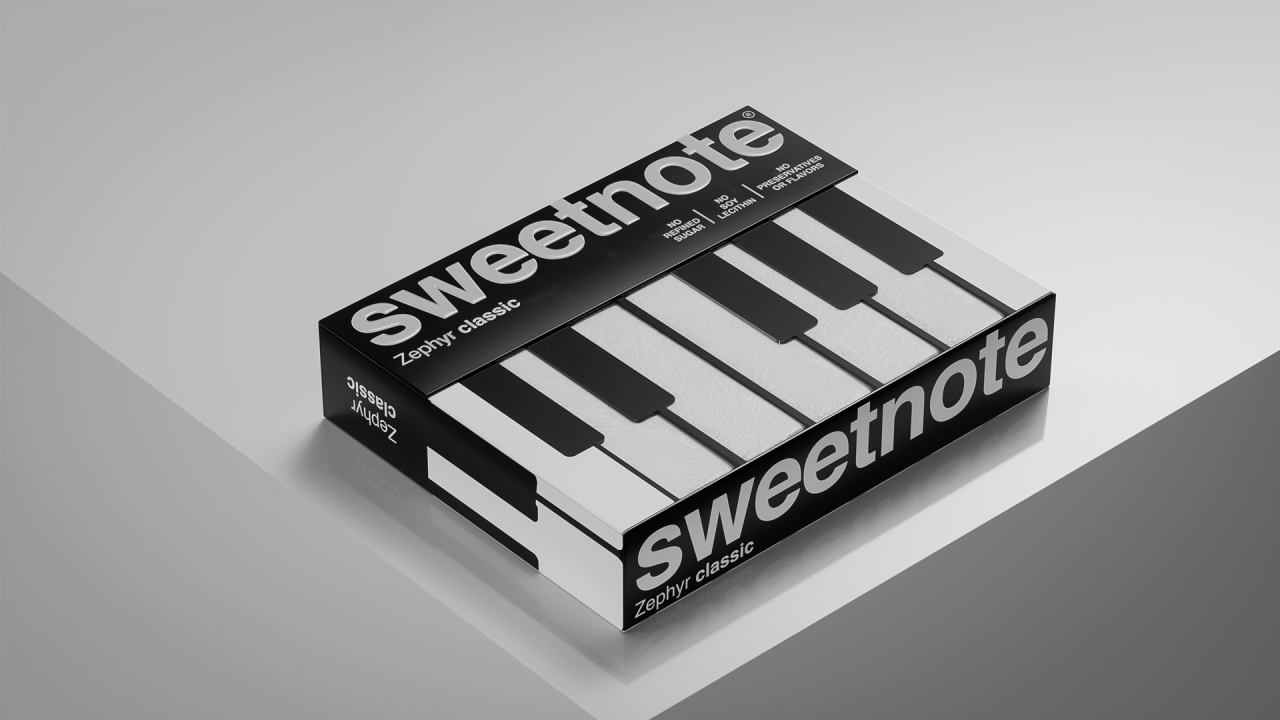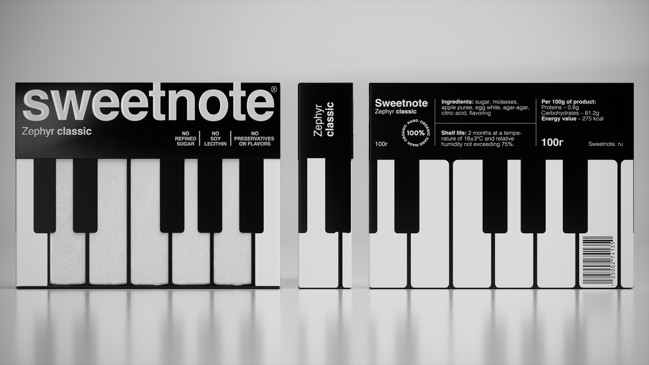 SWEETNOTE — пастила для любителей классической музыки, в основе дизайна которой лежит простая визуальная метафора. Идея строится на сходстве формы пастилы с клавишами пианино. Эта ассоциация легла в основу упаковки — минималистичной, контрастной и ритмичной. Пастилки выложены как клавиши, а коробка напоминает музыкальный инструмент ♫♩♪