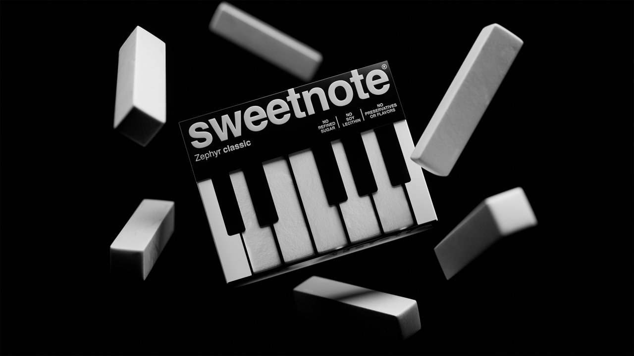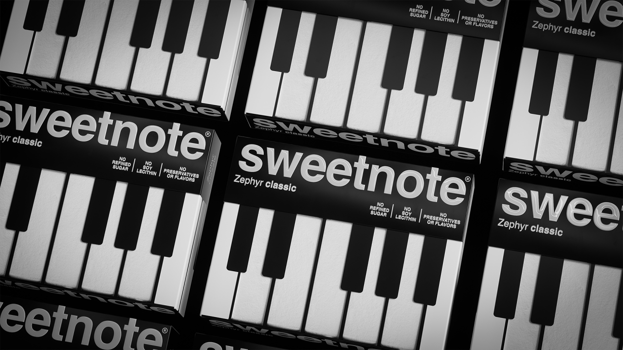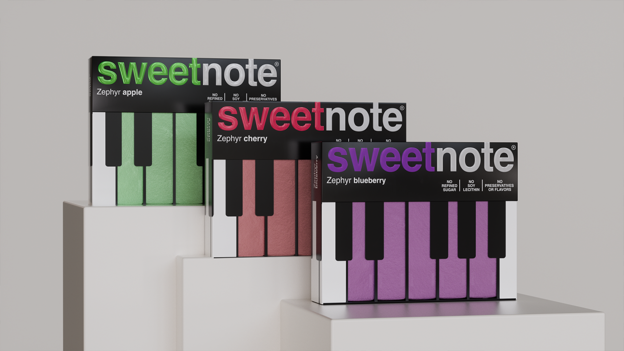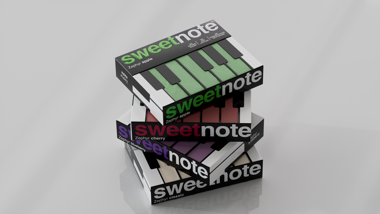 SWEETNOTE — пастила для любителей классической музыки, в основе дизайна которой лежит простая визуальная метафора. Идея строится на сходстве формы пастилы с клавишами пианино. Эта ассоциация легла в основу упаковки — минималистичной, контрастной и ритмичной. Пастилки выложены как клавиши, а коробка напоминает музыкальный инструмент ♫♩♪