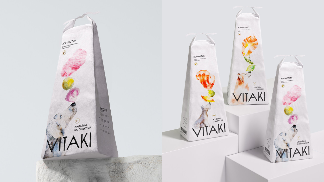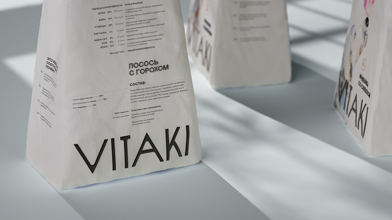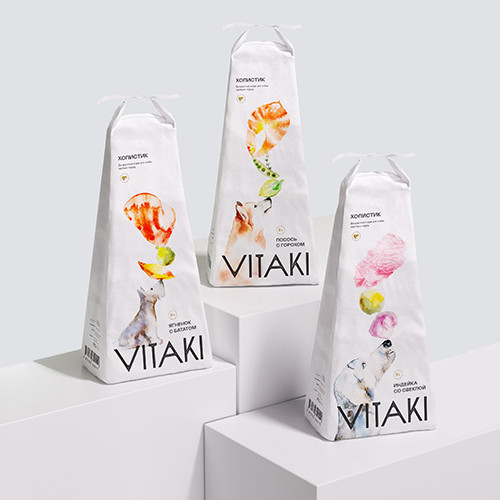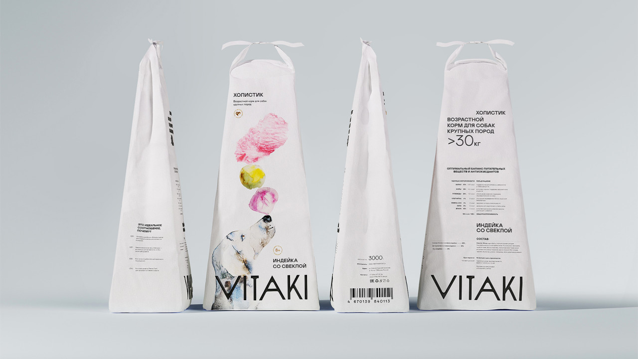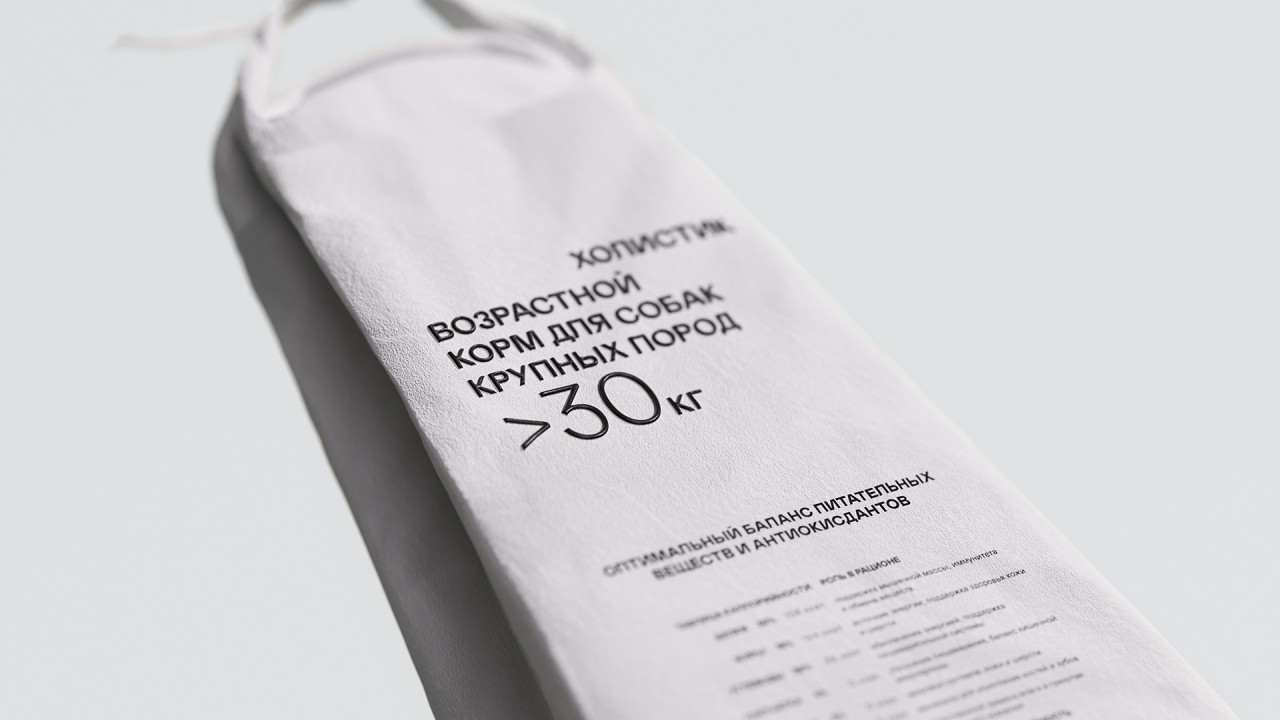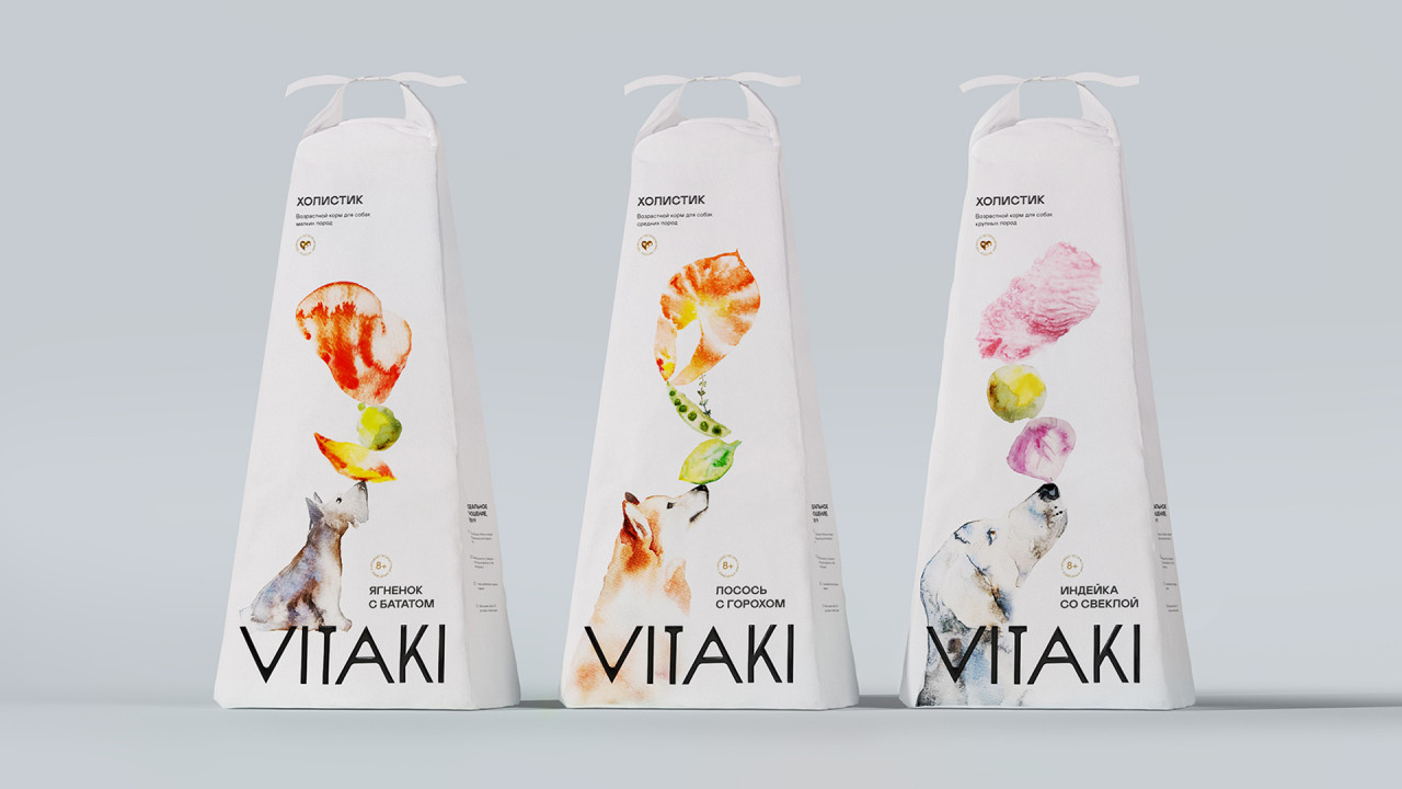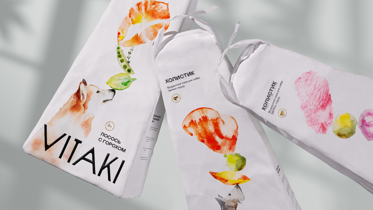 Иллюстрации, созданные вручную делают эмоциональный акцент бренда: они передают живость, лёгкость и добавляют продукту характер. Благодаря им айдентика выглядит более человечной и запоминающейся. В линейке кормов нарисованы 3 разные породы собак, чтобы визуально упростить навигацию у владельца